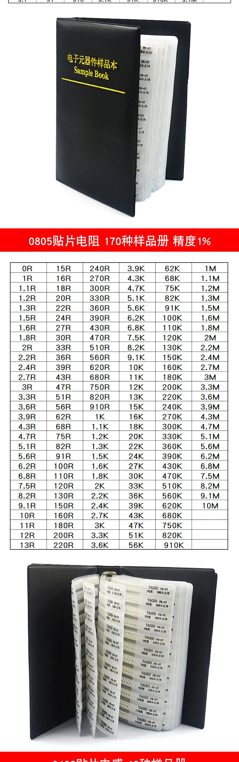 0201 0402 0603 0805 1206 1% 0R-10M SMD Resistor 170 s*50pcs/each=total 8500pcs Resistance Component Package Sample Book