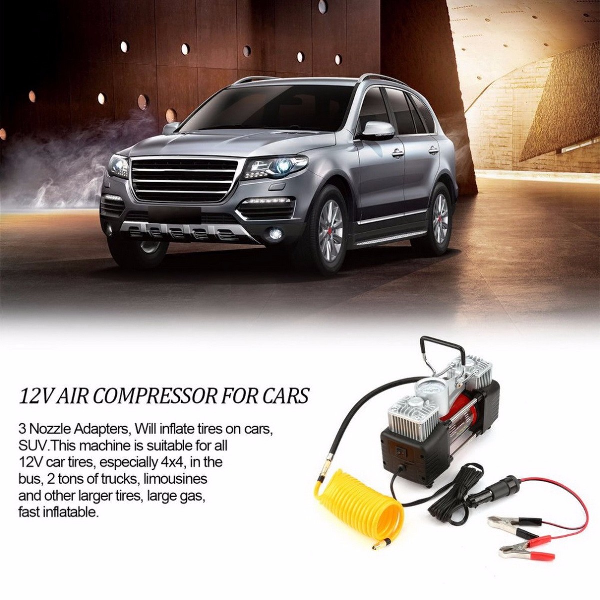 Features: Multi-purpose, applicable for vehicle tires, bike tires, motorcycle tires and balls. High effective, a tire can be inflated in 3 minutes. Support alarm and work lighting, applicable for the...