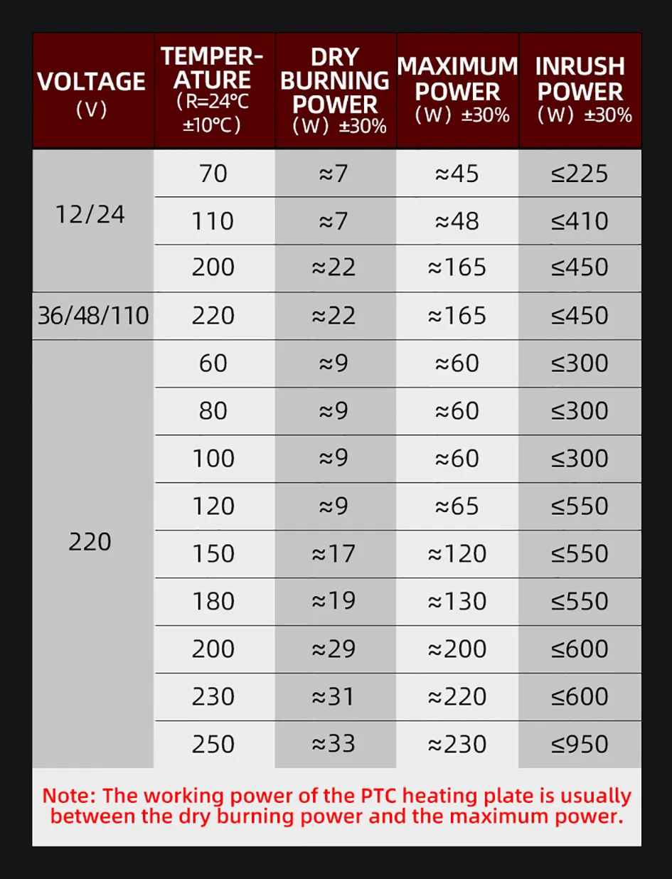 Using: This PTC is used to heat air or solids,must not be put into liquids and be exposed to much dust.