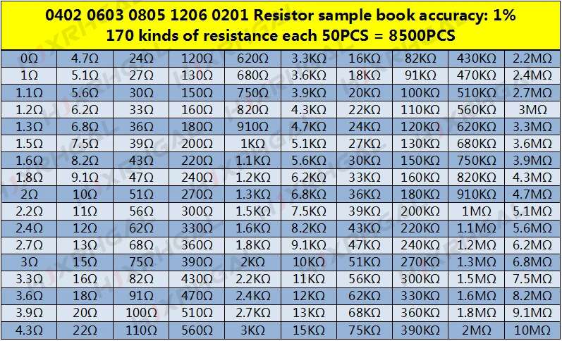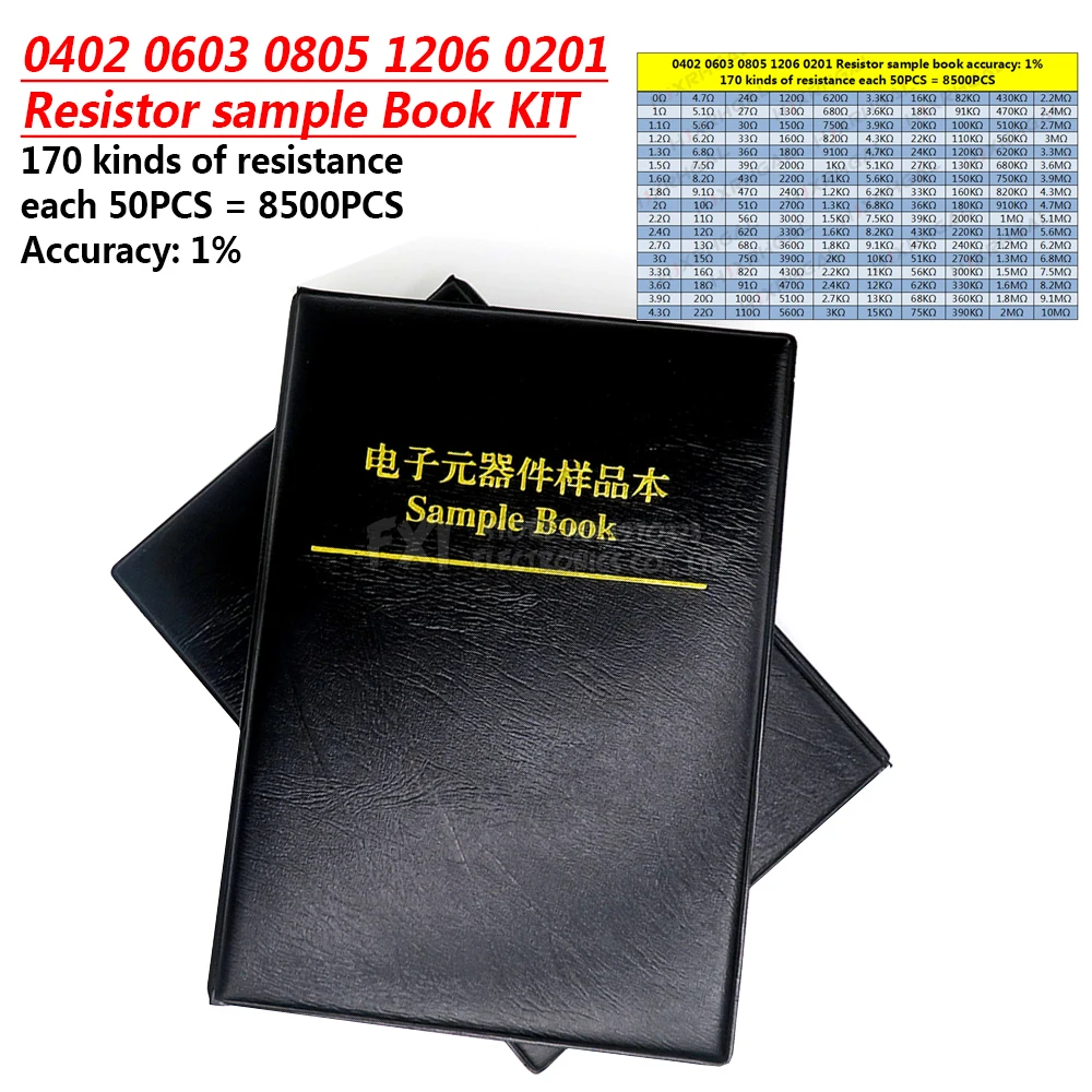 170values 4250PCS 8500pcs 0201 0402 0603 0805 1206 SMD resistor 1% 0R~10M diygba Sample Book Resistors Assortment Kit Resistors