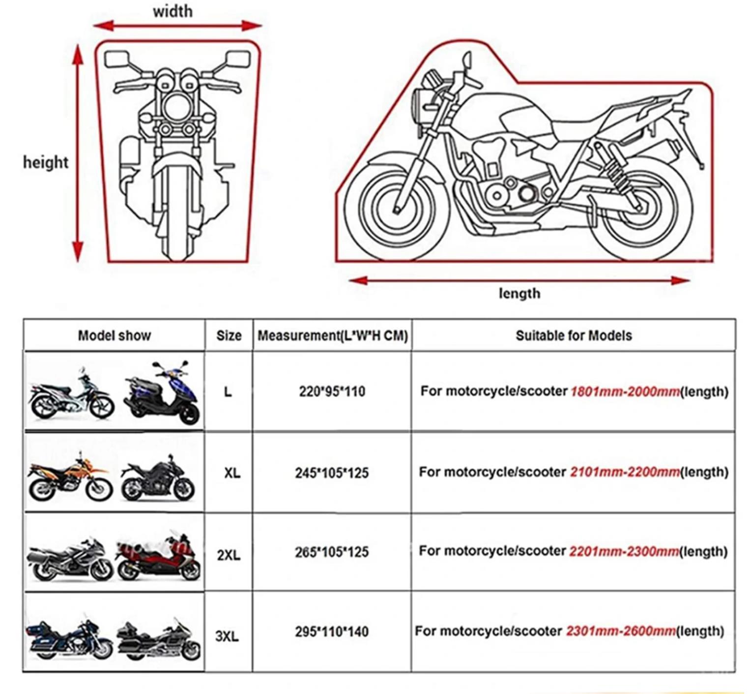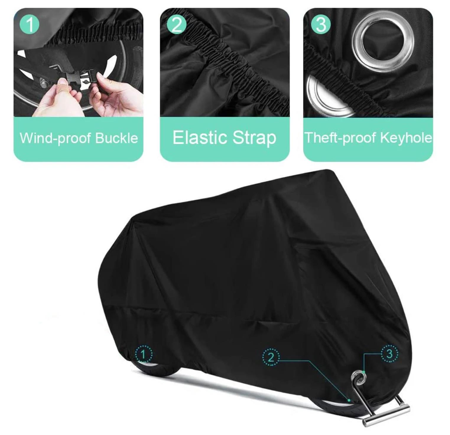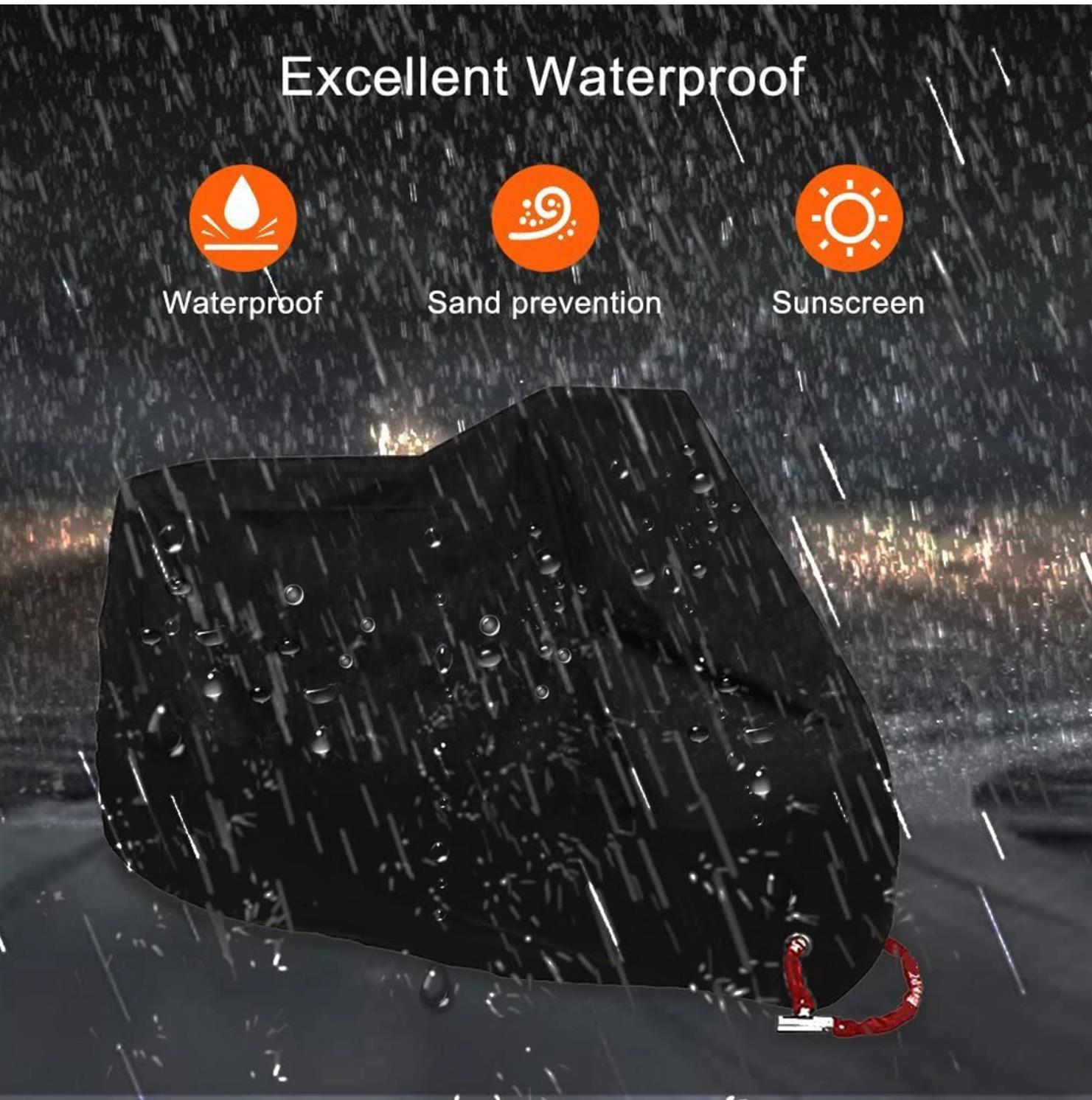 Made of premium waterproof Polyester material with a PU coat to keep sun damage at bay, protect your motorcycle against snow, rain, dust, tree & inclement weather with top to bottom coverage.