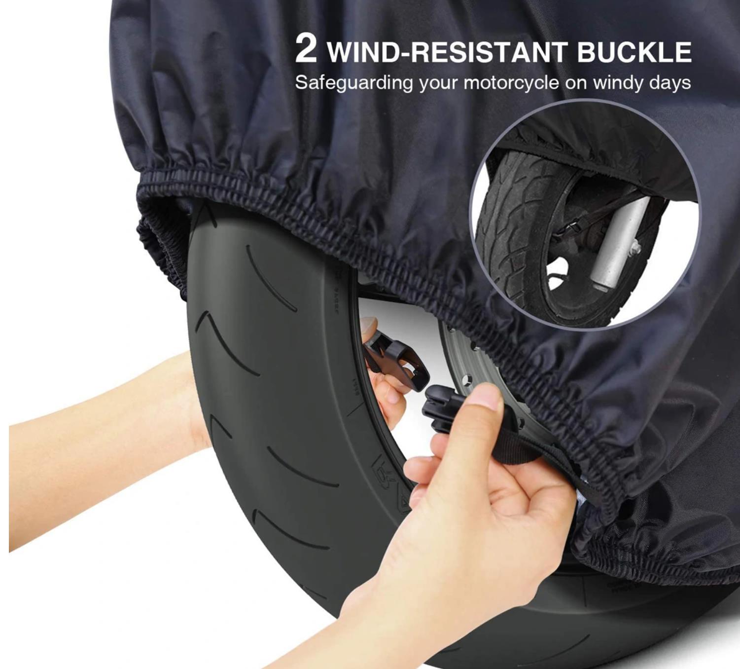The generous size covers your entire motorcycle, with close stitching and dual heavy-duty buckles on the bottom that holds up through any rain, storm, or heavy winds that come knocking on your door.