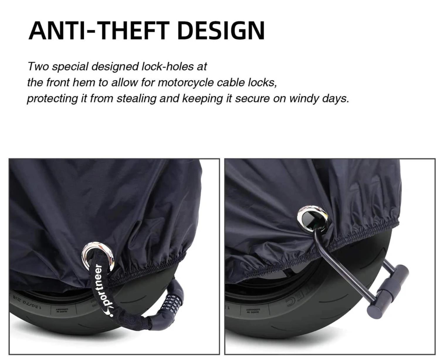 2 Aluminum lock-holes and 2 windproof buckles design, which help lock your motor and to better fix. When not in use, you can lock your motorcycle.