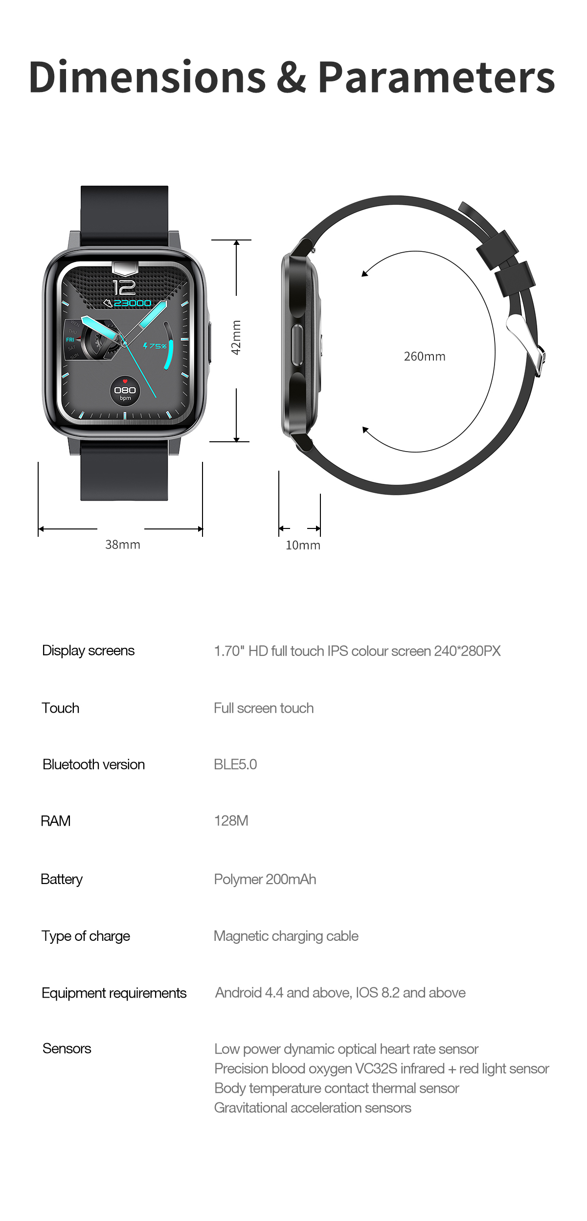 About US:We are a foreign trade technology company headquartered in Shenzhen, specialized in serving Southeast Asian customers, providing customers with one-stop services such as electronic materials, electronic products, computers and peripheral equipment, crafts, electronic watches, wearables, overall solutions, etc. We can also help Southeast Asian customers to purchase a variety of goods from China, providing high quality products.Find the right supplier for customers in China, grow together with customers, create miracles and the future.The founder of the company has served in the electronics industry for more than 20 years, has rich experience and technology, has its own professional electronics factory and rich supply chain. Exquisite square screen Ultra-precise blood oxygen blood pressure heart rate measurement 24 hours a day heart rate monitoring Ultra-low power consumption chip, more energy saving and longer use time...