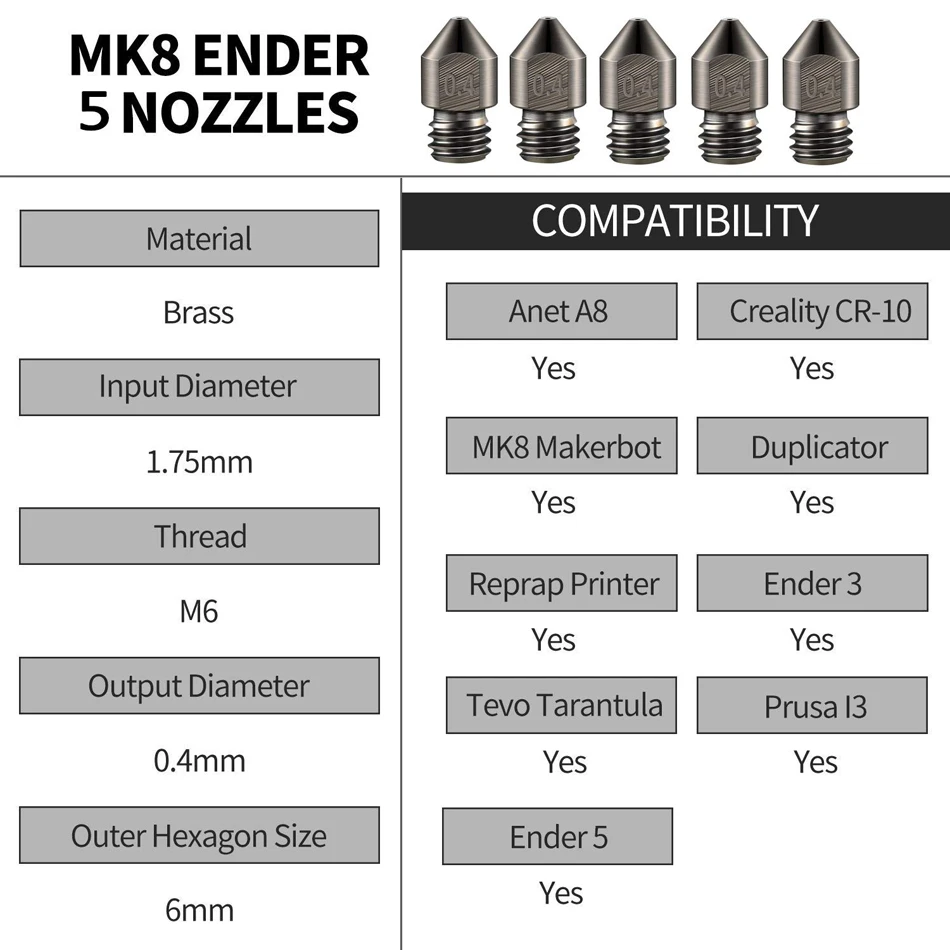 【Wide Compatibility】These 3D printer nozzles compatible with MK8 hotend for Creality 3D printers, such as Ender-2/ Ender-3/ Ender-3 pro/ Ender-5, also compatible with Creality CR-10 all-metal hotend, Prusa i3, Anet A8, Reprap, etc.