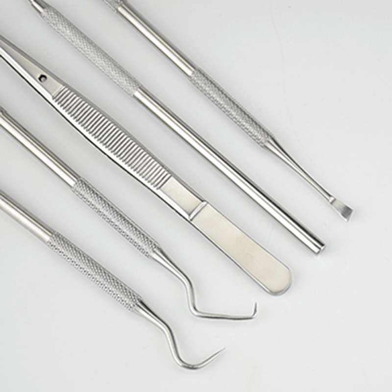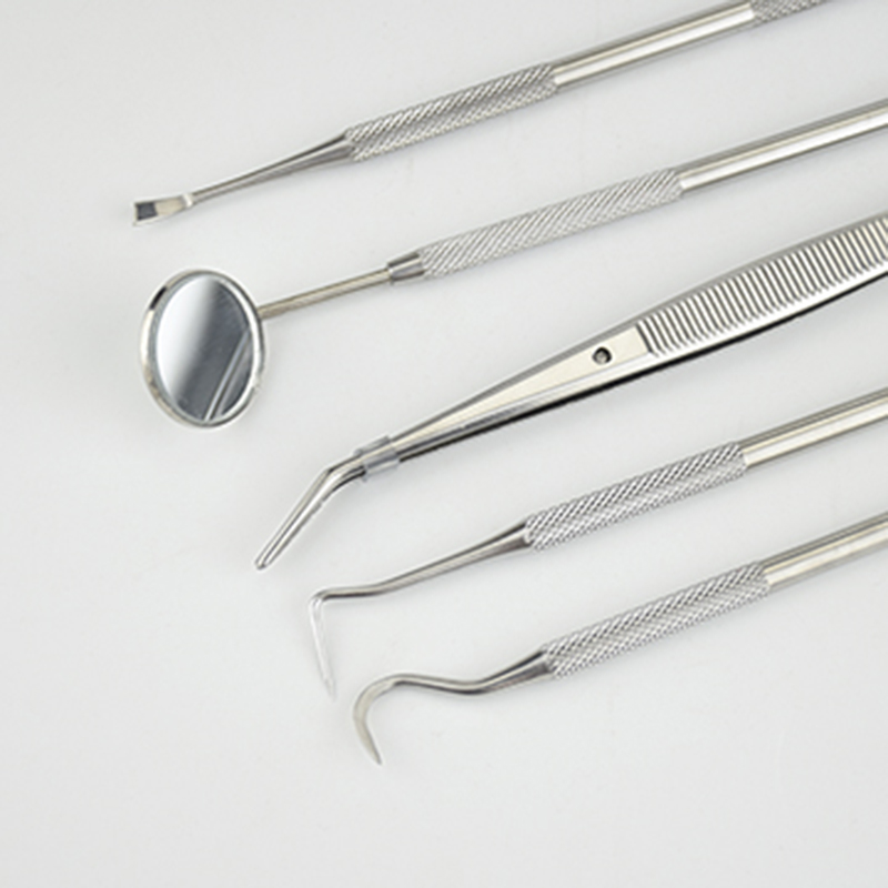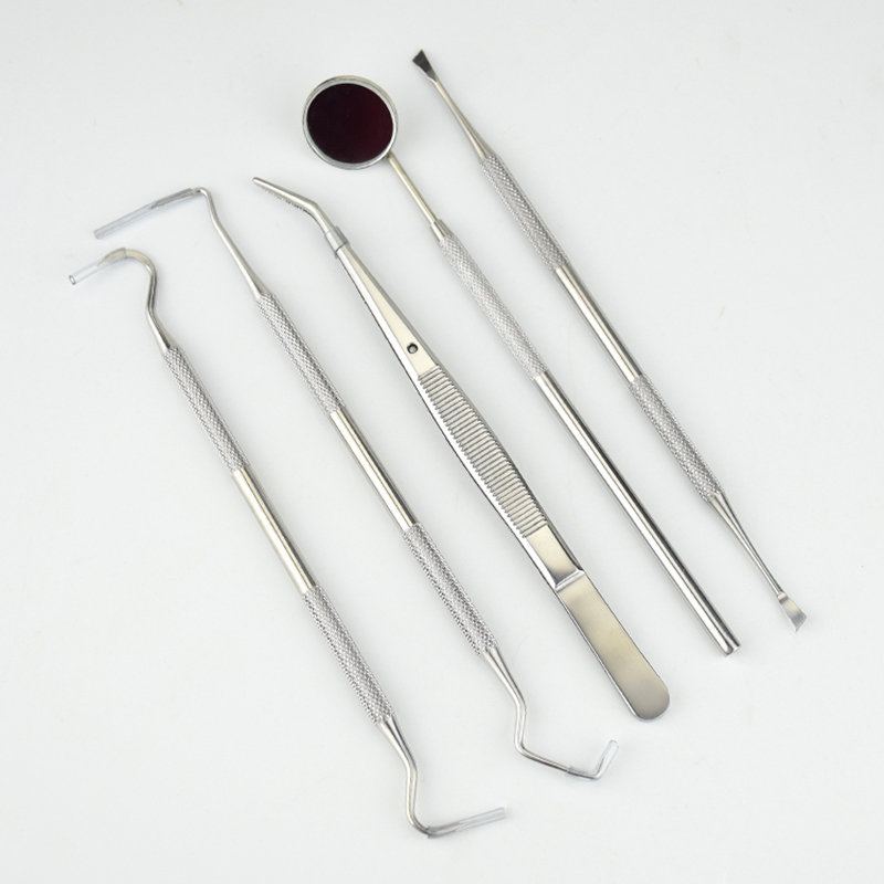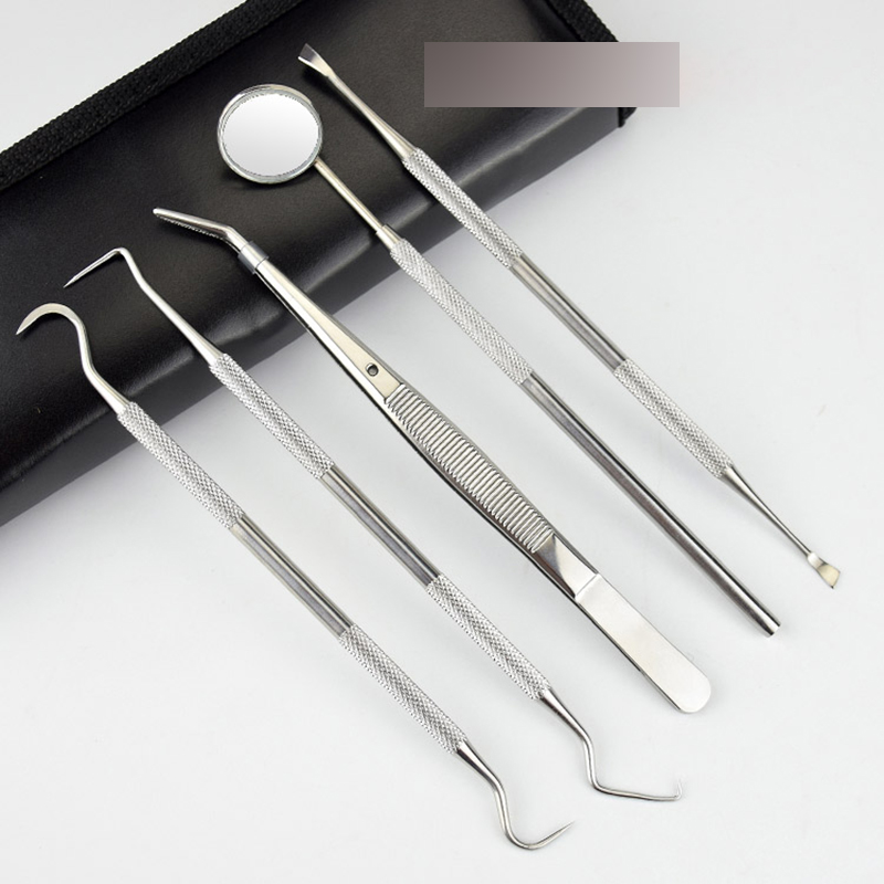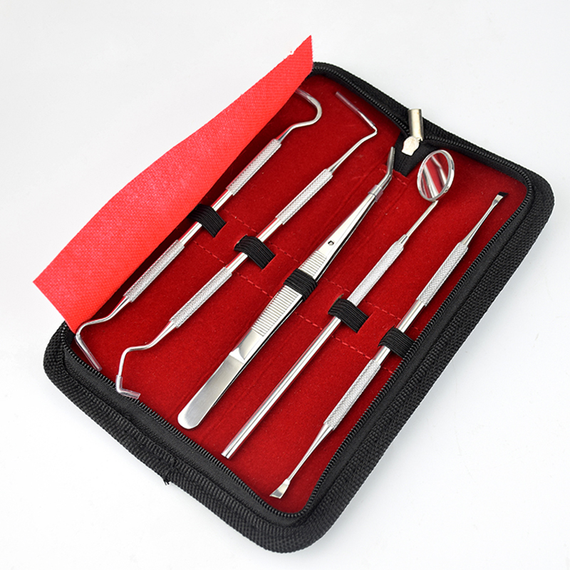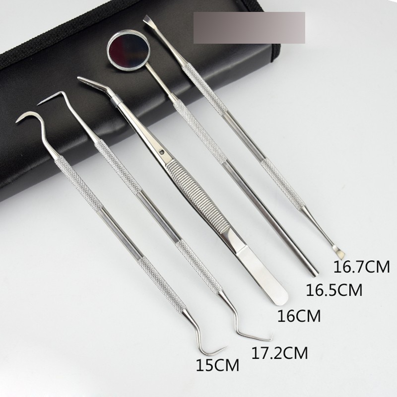5-in-1 stainless steel dental tool kit, contain a Tweezers, mouth mirror, Probe and two Capsule Cleaner.