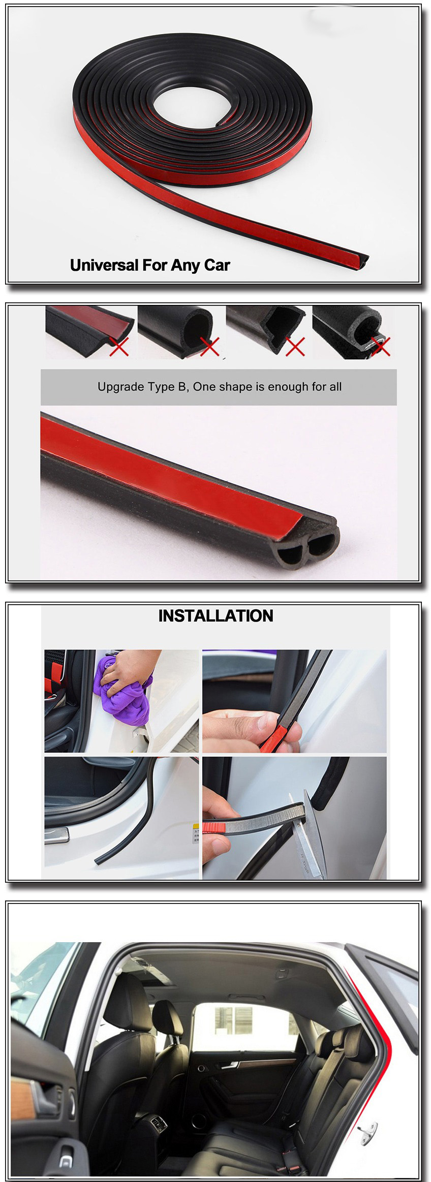 8 Meters B Type Adhesive Car Rubber Seal Sound Insulation Car Door Sealing Strip Weatherstrip Edge Trim Noise Insulation Black