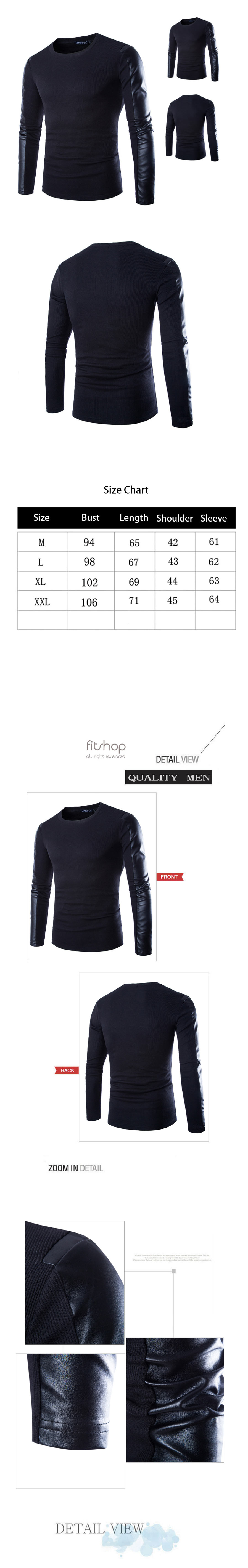 Autumn PU Leather Stitching Long Sleeve Round Neck Men\'s T-Shirt, Casual Male Tee Top T-Shirt Black/XXL