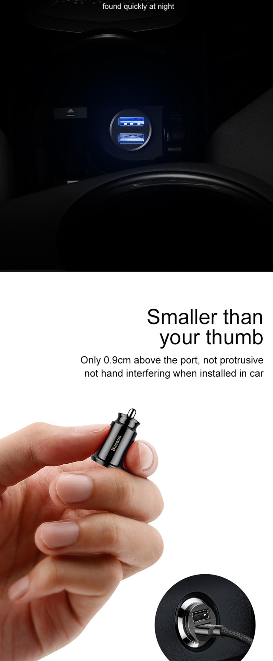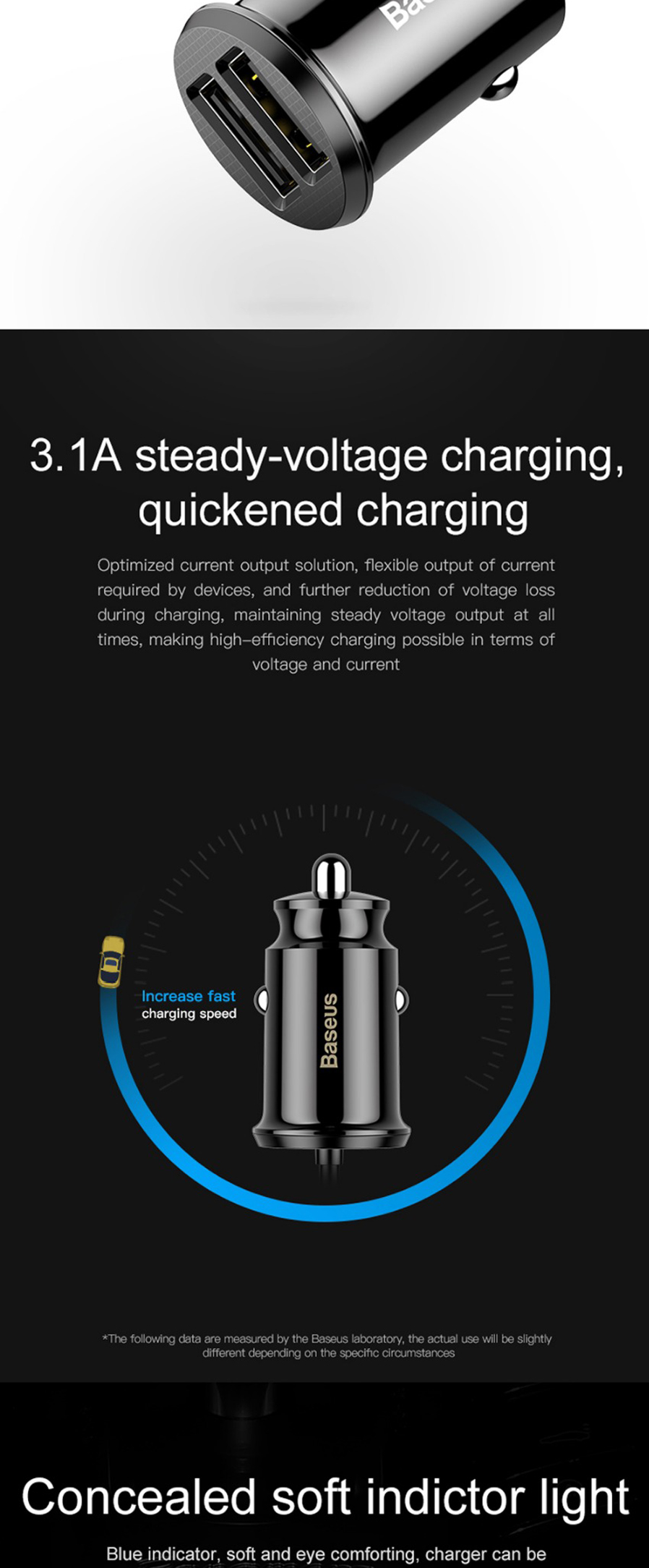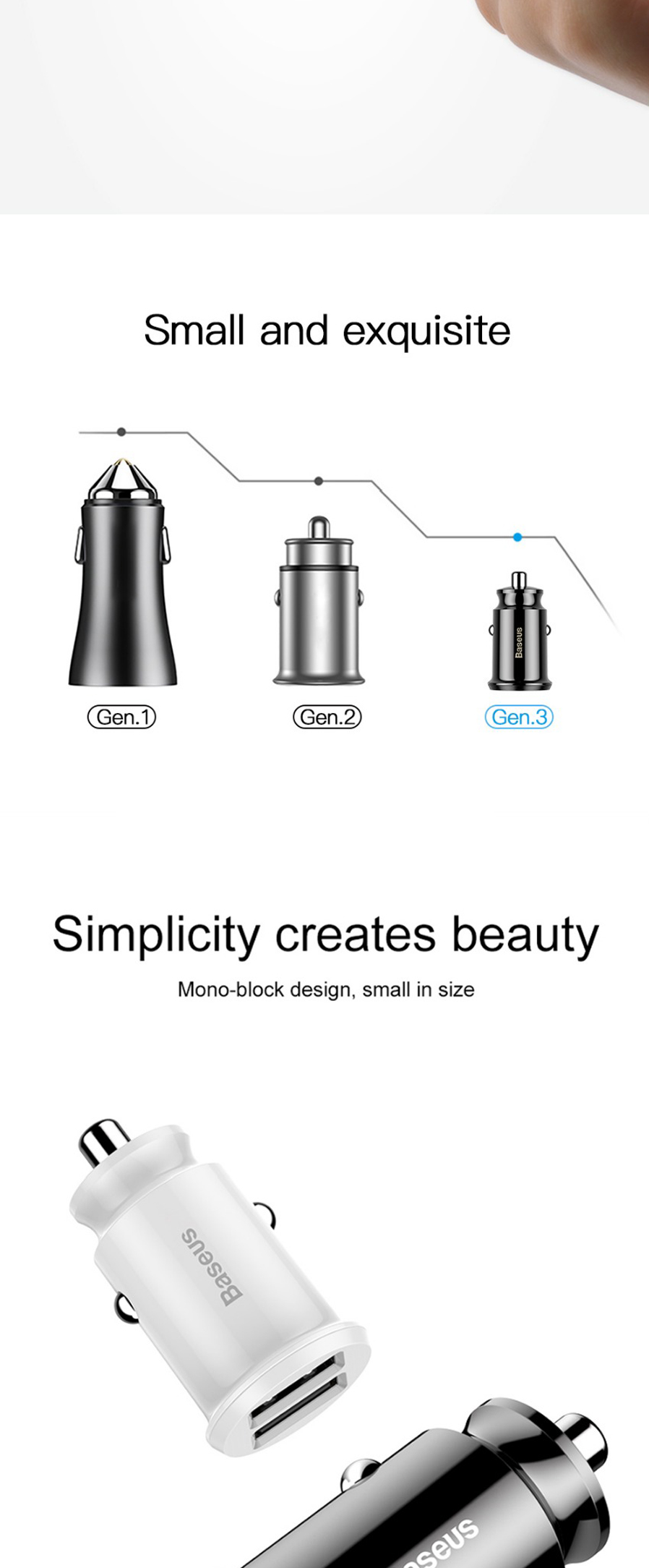 Baseus Mini 3.1A Fast Charge Dual USB Car Charger for IPHONE, Samsung Mobile Phones Tablet PCs - Whie