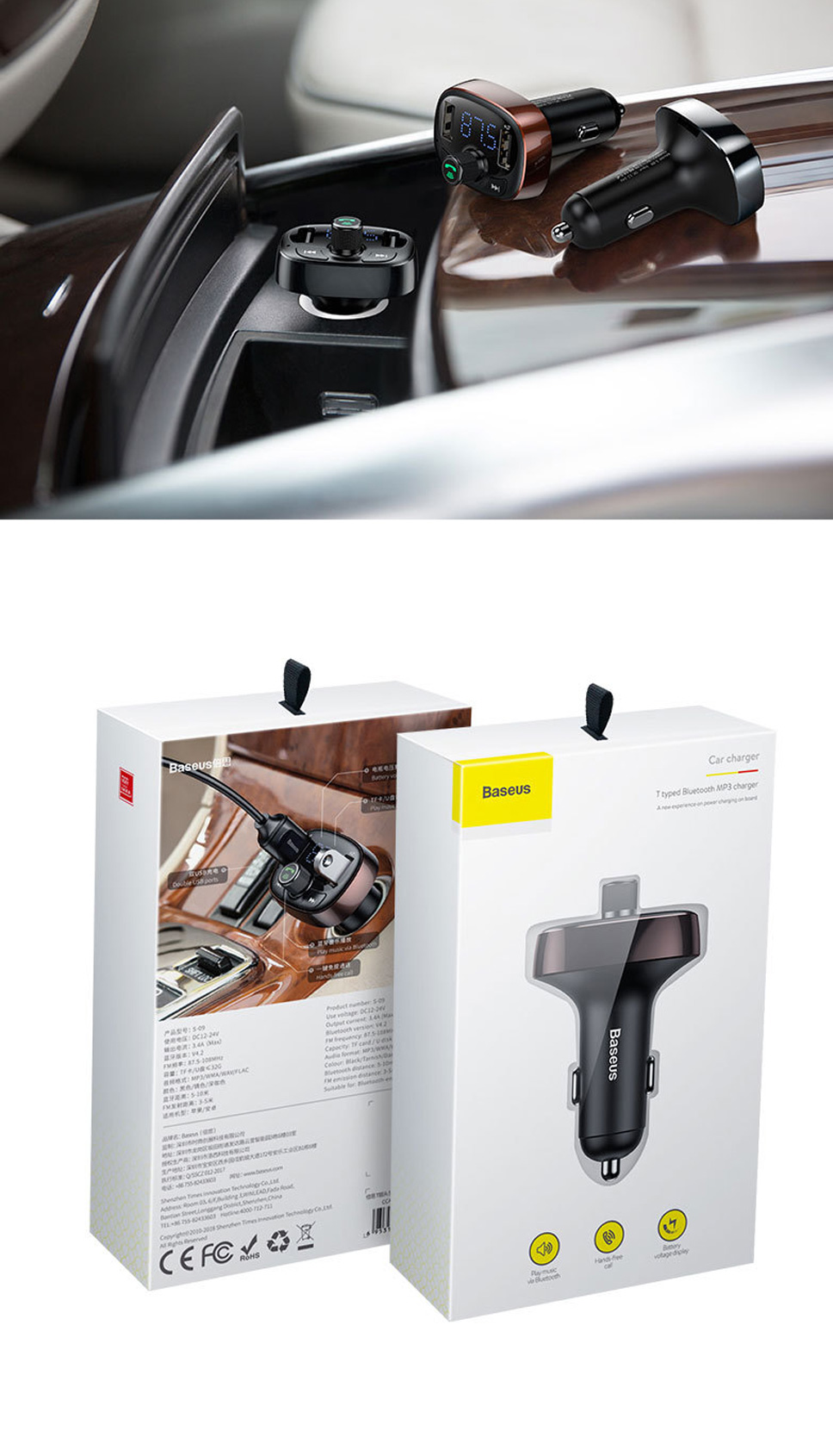 Baseus S-09 Car MP3 Player Bluetooth Car Kit FM Transmitter Wireless Radio Adapter 3.4A USB Charger Media Players Black
