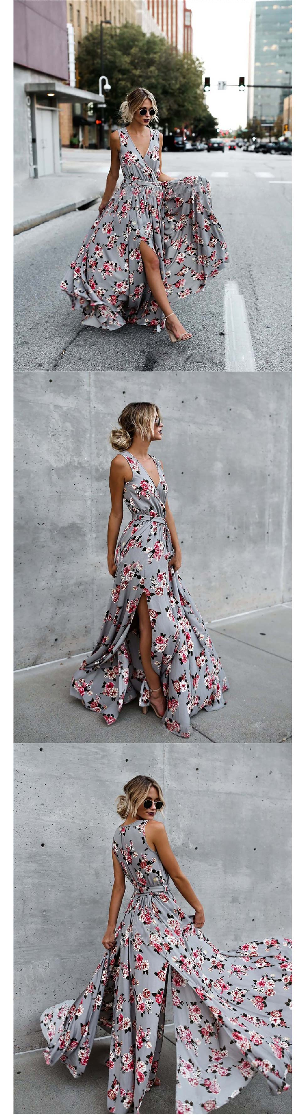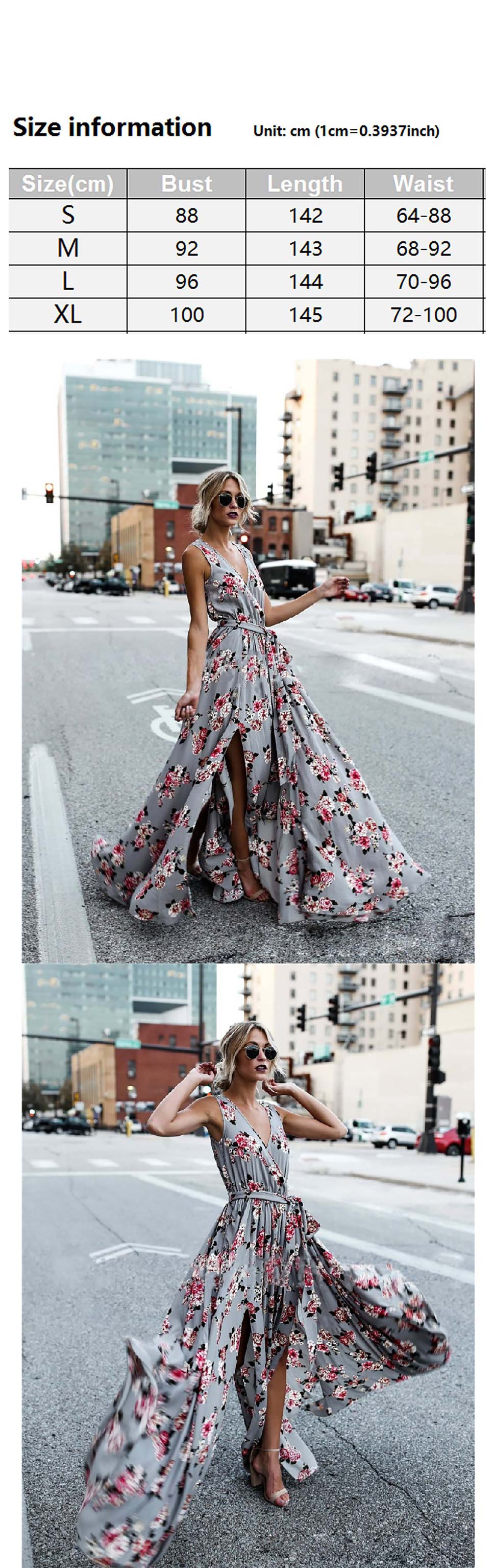 Bohemian Summer Dress For Women Sexy V-Neck Maxi Floral Print Sashes Sleeveless High Slit Dresses Gray/M