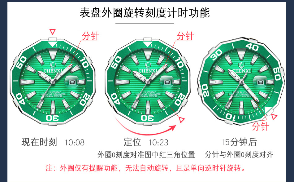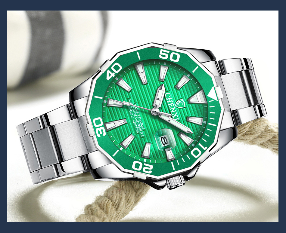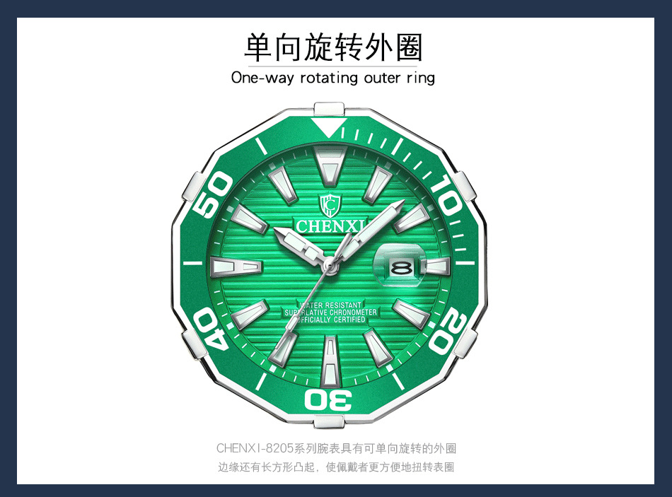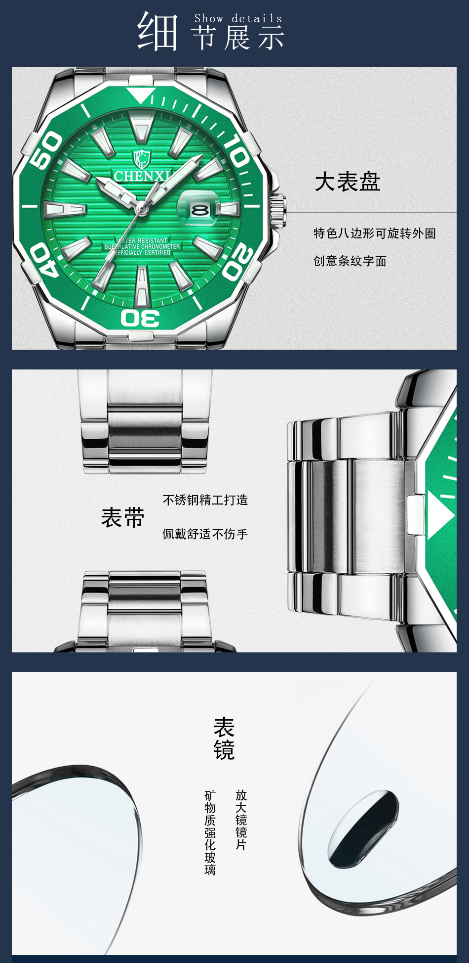 About US:We are a foreign trade technology company headquartered in Shenzhen, specialized in serving Southeast Asian customers, providing customers with one-stop services such as electronic materials, electronic products, computers and peripheral equipment, crafts, electronic watches, wearables, overall solutions, etc. We can also help Southeast Asian customers to purchase a variety of goods from China, providing high quality products.Find the right supplier for customers in China, grow together with customers, create miracles and the future.The founder of the company has served in the electronics industry for more than 20 years, has rich experience and technology, has its own professional electronics factory and rich supply chain.Movement brand: domestic quartz movement Color: green, black, blue Model: CX-8205 Thickness: 13mm Special features: luminous, calendar, chronograph scale Buckle style: Bilateral snap clasp Dial diameter: 43.5mm Dial shape: round...