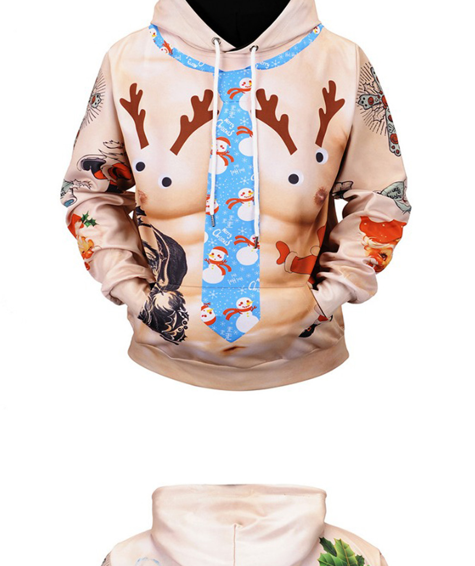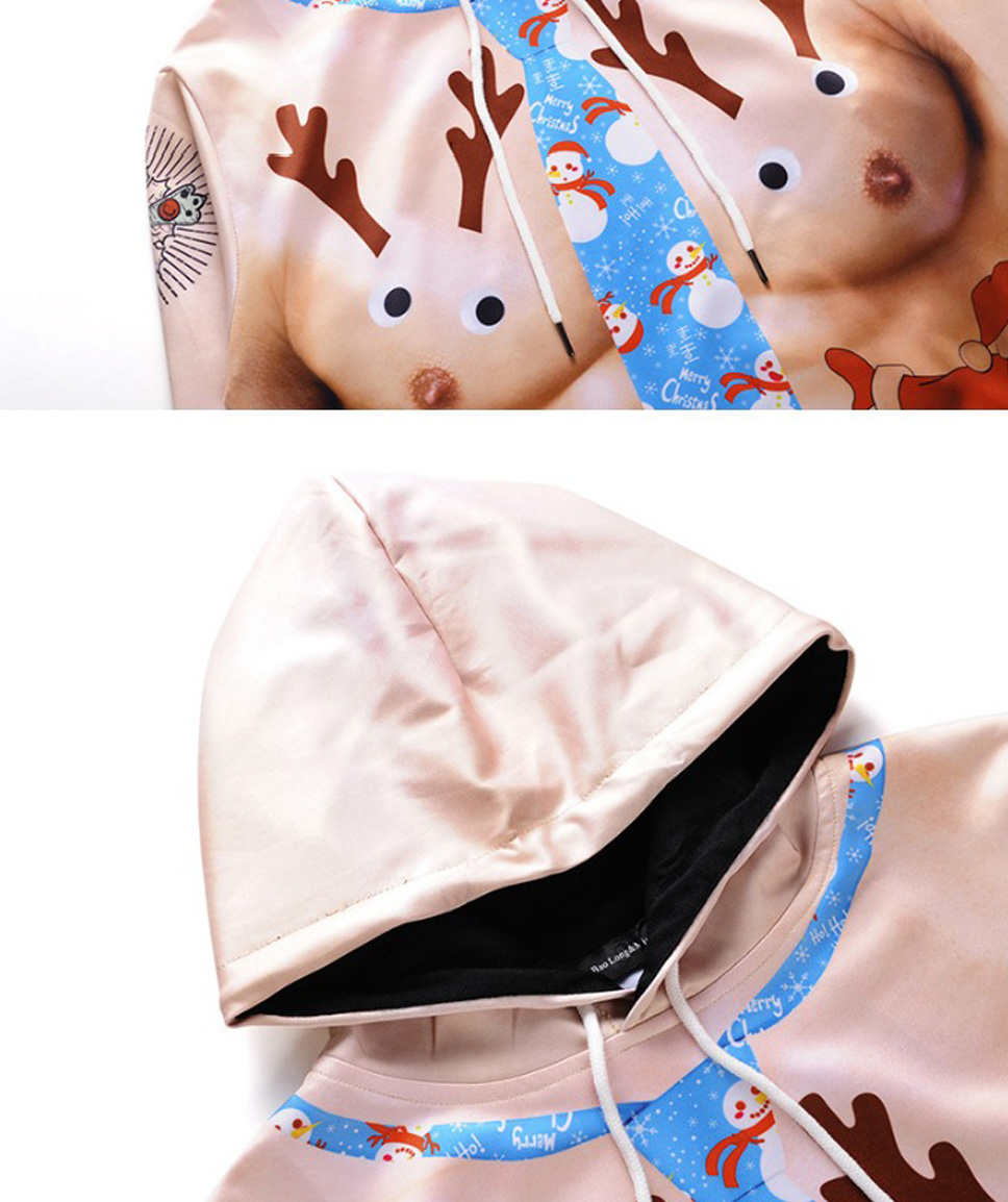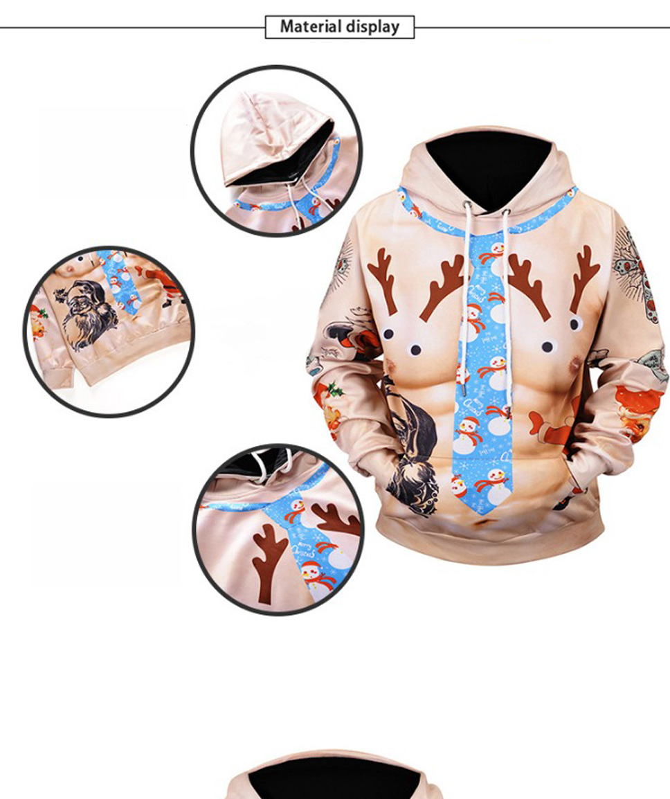 Christmas Autumn Winter Casual Hooded Hoodies 3D Print Cartoon Reindeer Loose Sweatshirts For Men Champagne/XXL