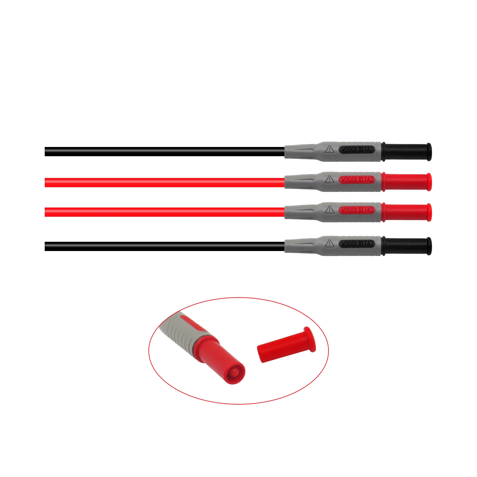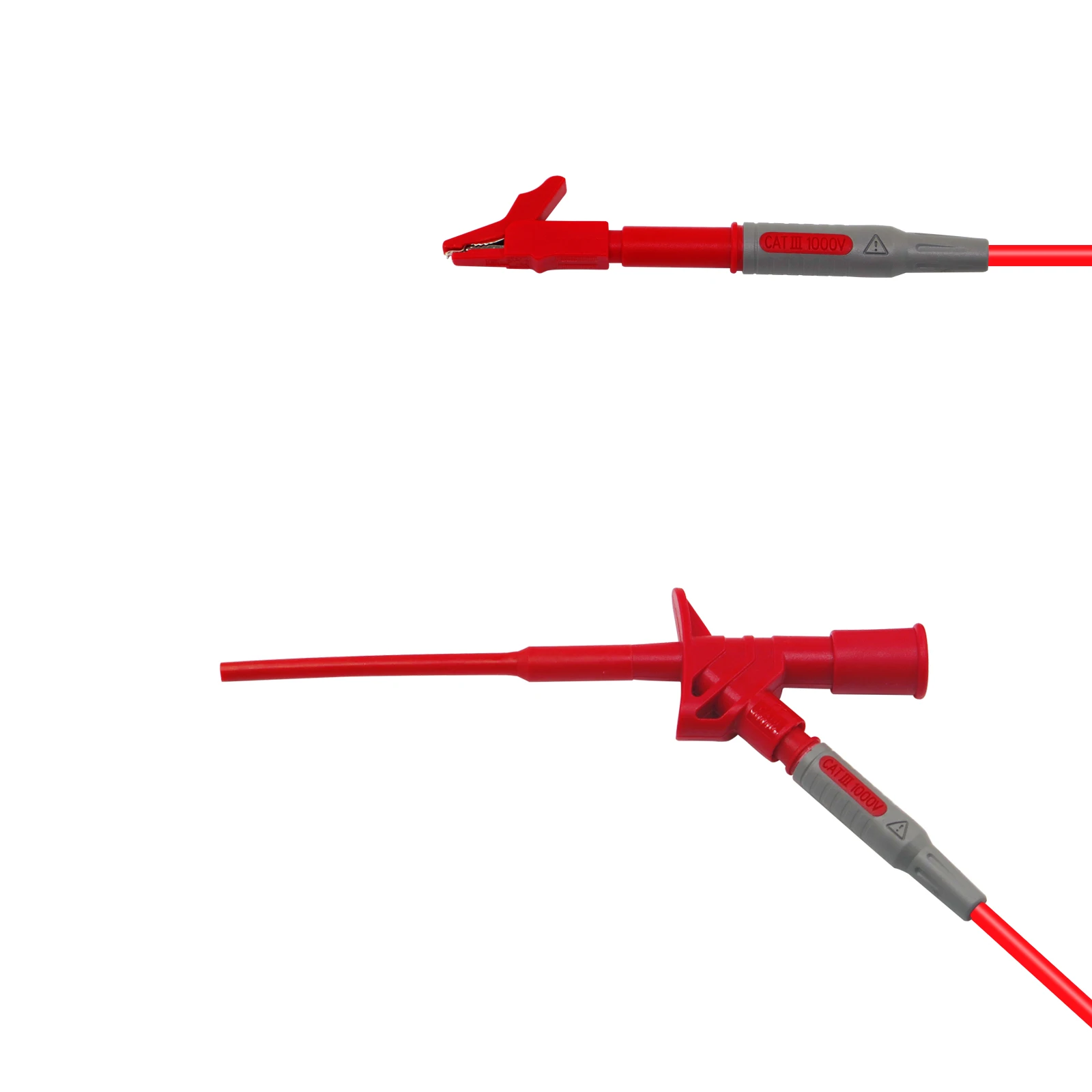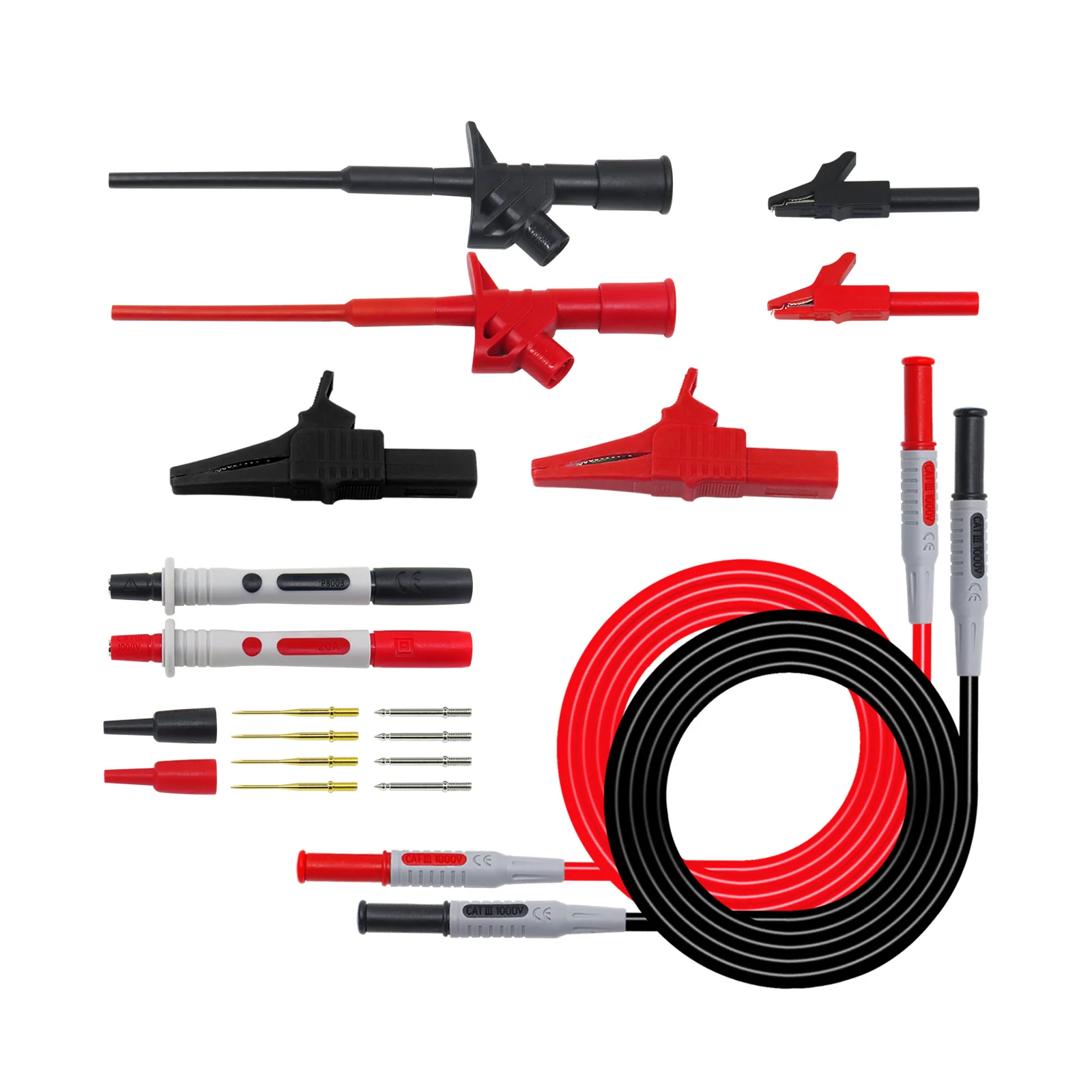 P1600B test lead kit contents: Standard 4 mm banana plug test lead, large safety alligator clip (1 pair), small safety alligator clip (1 pair), replaceable probe body (1 pair), and large test hook (1 pair). Versatile and portable.