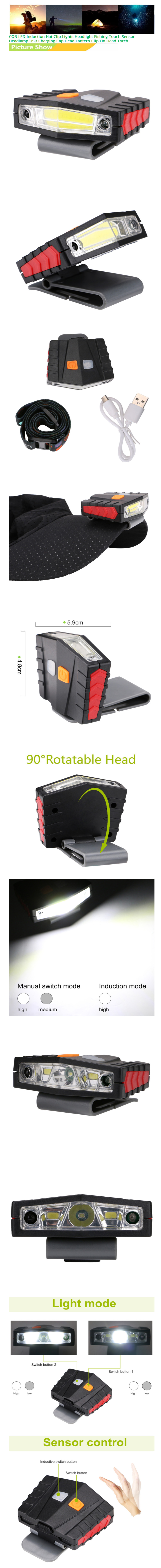 COB LED Induction Hat Clip Lights Headlight Fishing Touch Sensor Headlamp USB Charging Cap Headlights White/Black