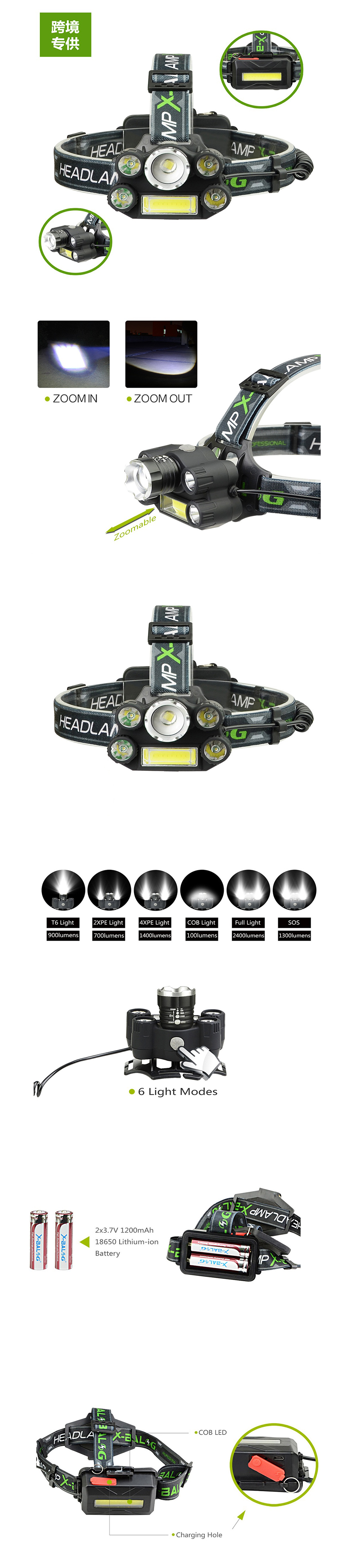 CREE T6 LED+COB Headlight 7 Mode Headlamp Rechargeable Head Flashlight Lamp Frontal Camp Hike Light Cold White/Black