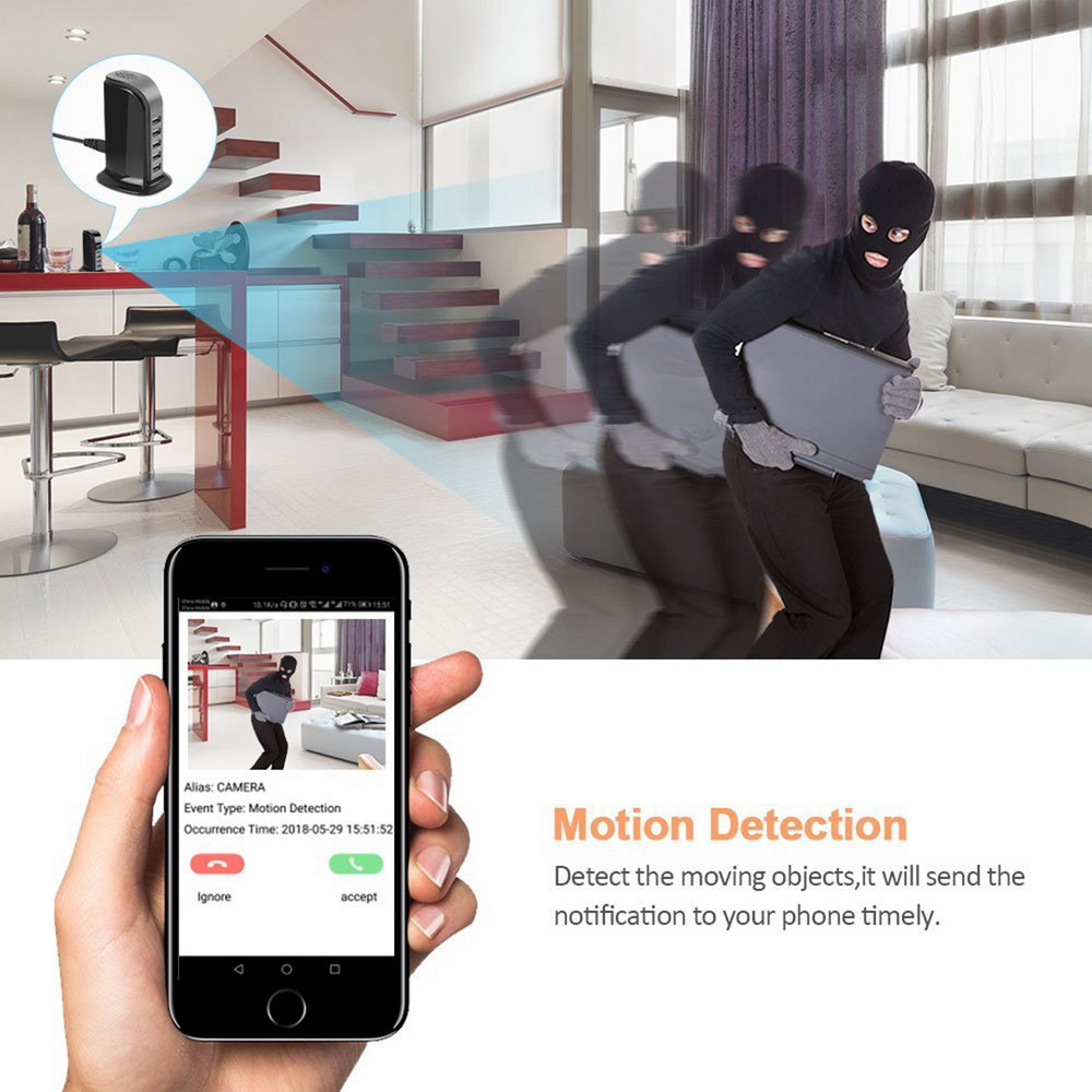 ?€� Motion Detection Alarm?€¡®Adjustable sensitivity motion detection system equipped with this USB charger camera.Once motion detection is triggered, you will get the notification on your phone timely.Also capture photos and save in user\\'s APP automatically,you won\\'t miss any exciting moment.The distance of motion detection can up to 9.8ft.