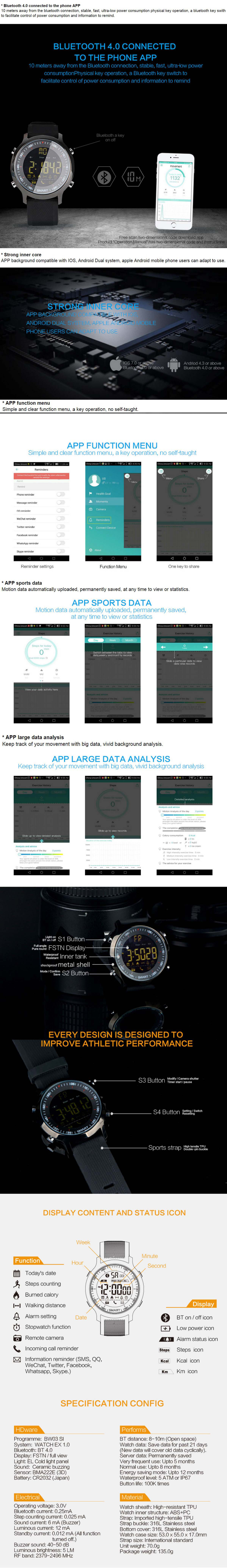 * More Function: Support 24-hour monitor, Steps Counting, Burned Calory, Walking Distance, Cloud Service, Data Analysis, Target Management, Calendar Date, Low Reminder, Alarm clock, Stopwatch, Calculator, Photograph, Dial, Calling Remind, Clock, Anti-lost, SMS , Notification Bluetooth Sync, Time Sync, Professional stopwatch, Music Player, Remote camera and so on, all in one.