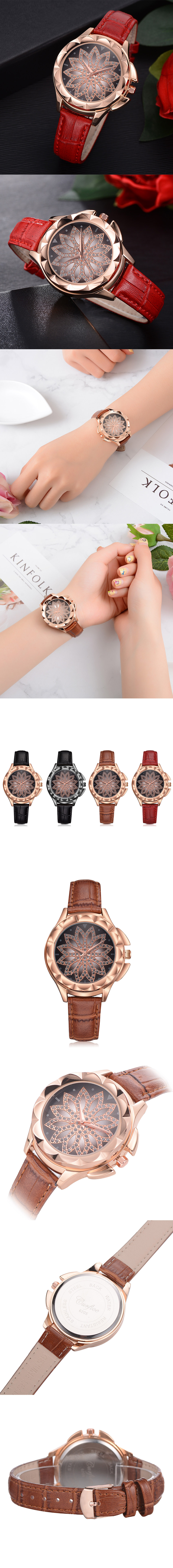 Fashion Flower Pattern Diamond Dial Women\'s Quartz Watch W/ PU Leather Strap Gold