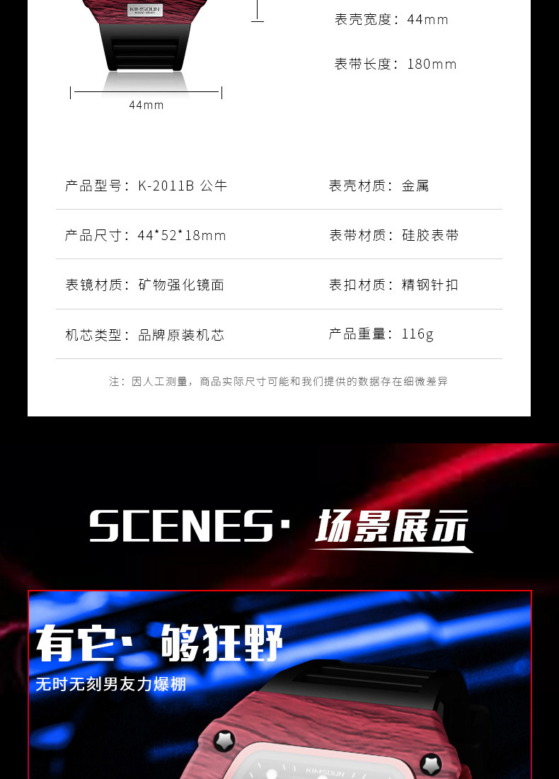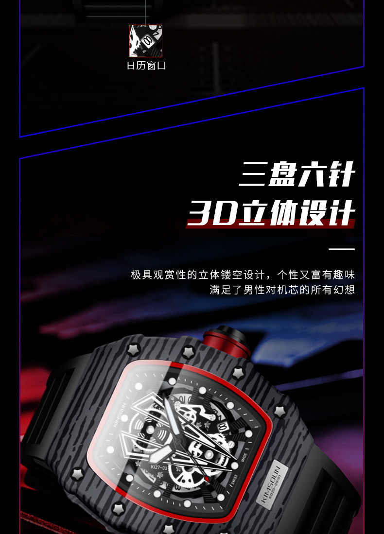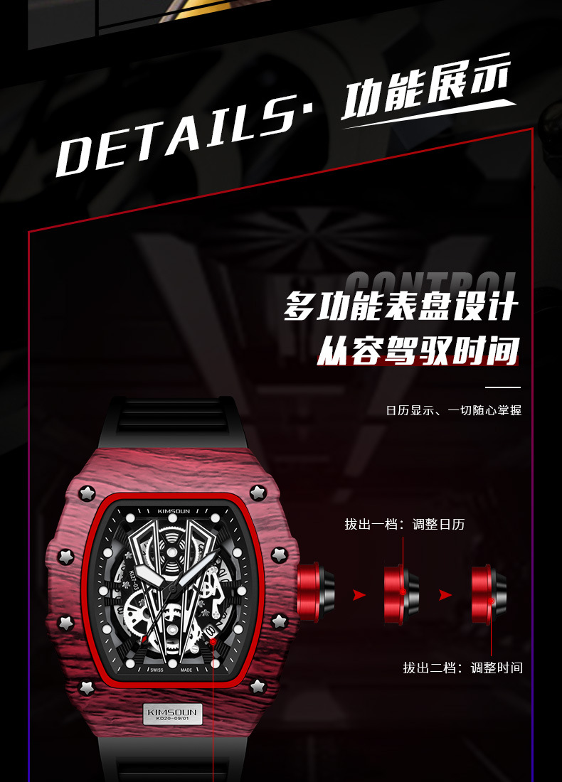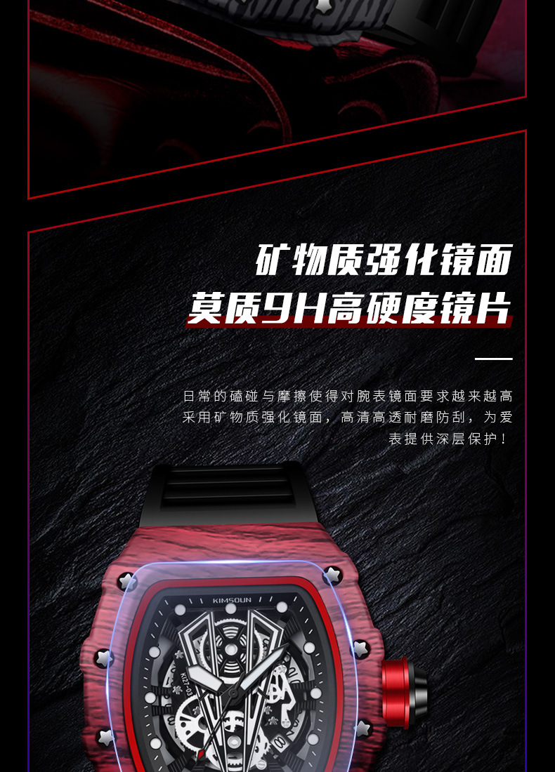 Movement brand: Kingston Color: Black Shell Red Belt-Bull, Black Shell Black Belt-Bull, Red Shell Black Belt-Bull, Black Shell Red Belt-Half Moon, Black Shell Black Belt-Half Moon, Red Shell Black Belt-Half Moon Model: K-2011B Thickness: 18mm Special features: luminous, calendar Buckle style: pin buckle Dial diameter: 44mm Dial shape: round Waterproof: no Buckle material: stainless steel Brand: KIMSDUN/ Kingston Item No.: K-2011B Movement model: high quality quartz movement Movement type: Quartz Strap Material: Silicone Applicable people: male Bottom Type: Ordinary Crown Type: Screw Crown Mirror material: Mineral tempered glass mirror Market Year/Season: Summer 2021 Display type: pointer + number Style: leisure Movement origin: domestic Case Material: Metal