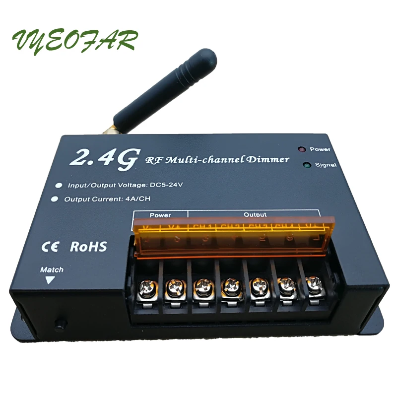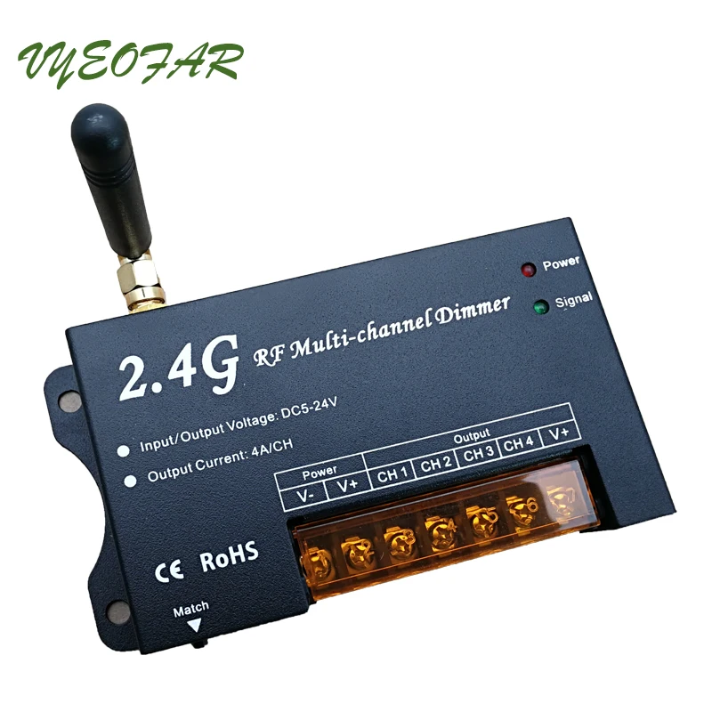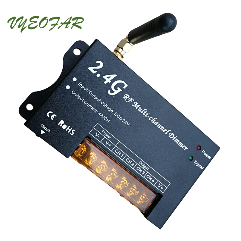 2.4G wireless multi-channel dimmer is a kind of controller which aims at each channel dimming separately, through dimming separately to each channel of controller, can achieve matching of different colors, thus a different color can show up. This controller has high dimming precision, with effect common dimmer can’t achieve.