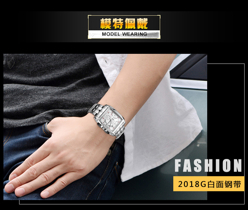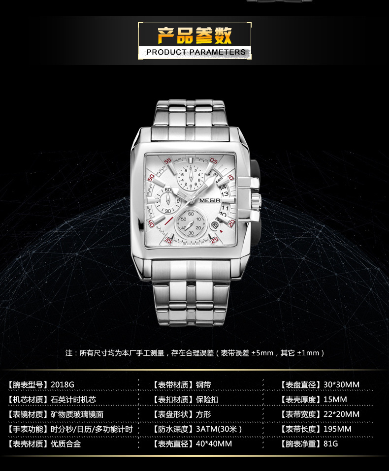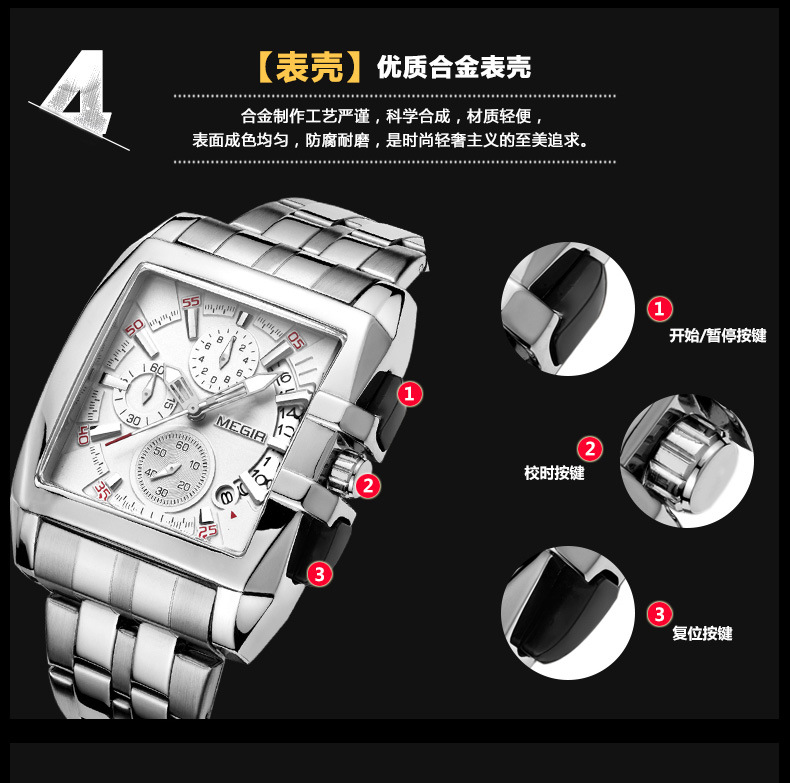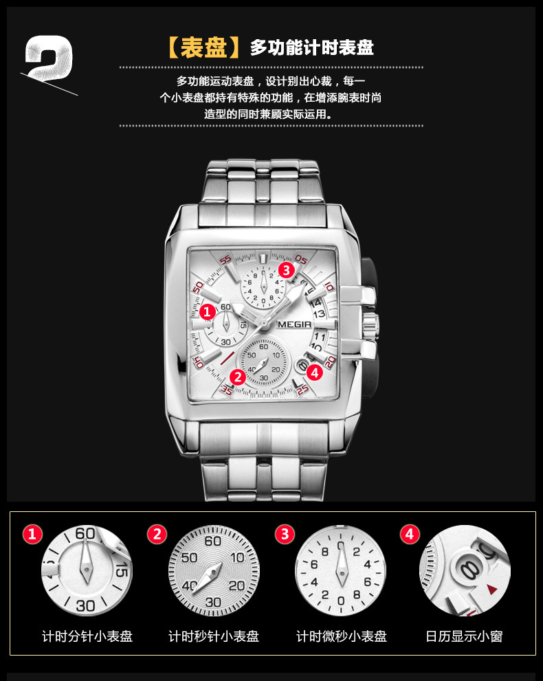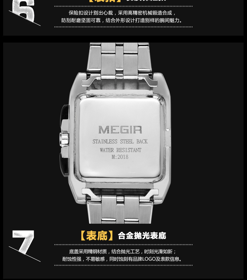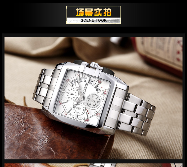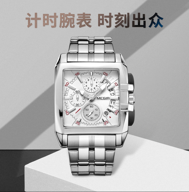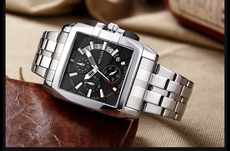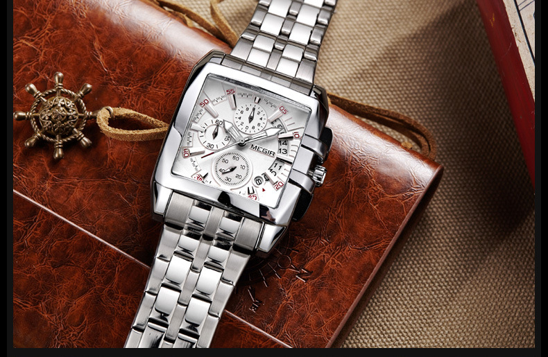 MEGIR steel strap men's watch sports outdoor fashion men's Square waterproof quartz men's causal Watch 2018