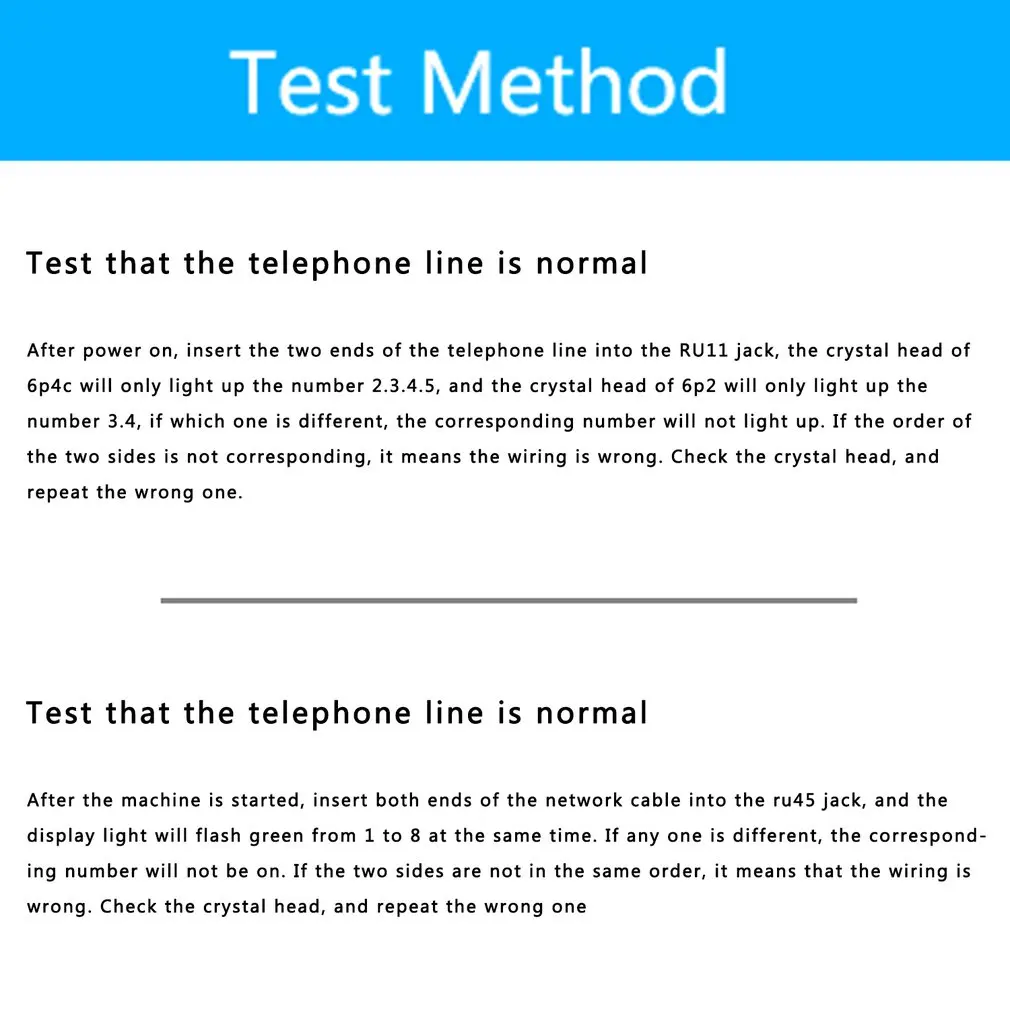 any light is not on or turns on unsequently, the cables are broken. Specifications: Test cable: RJ11, RJ45 Package included: