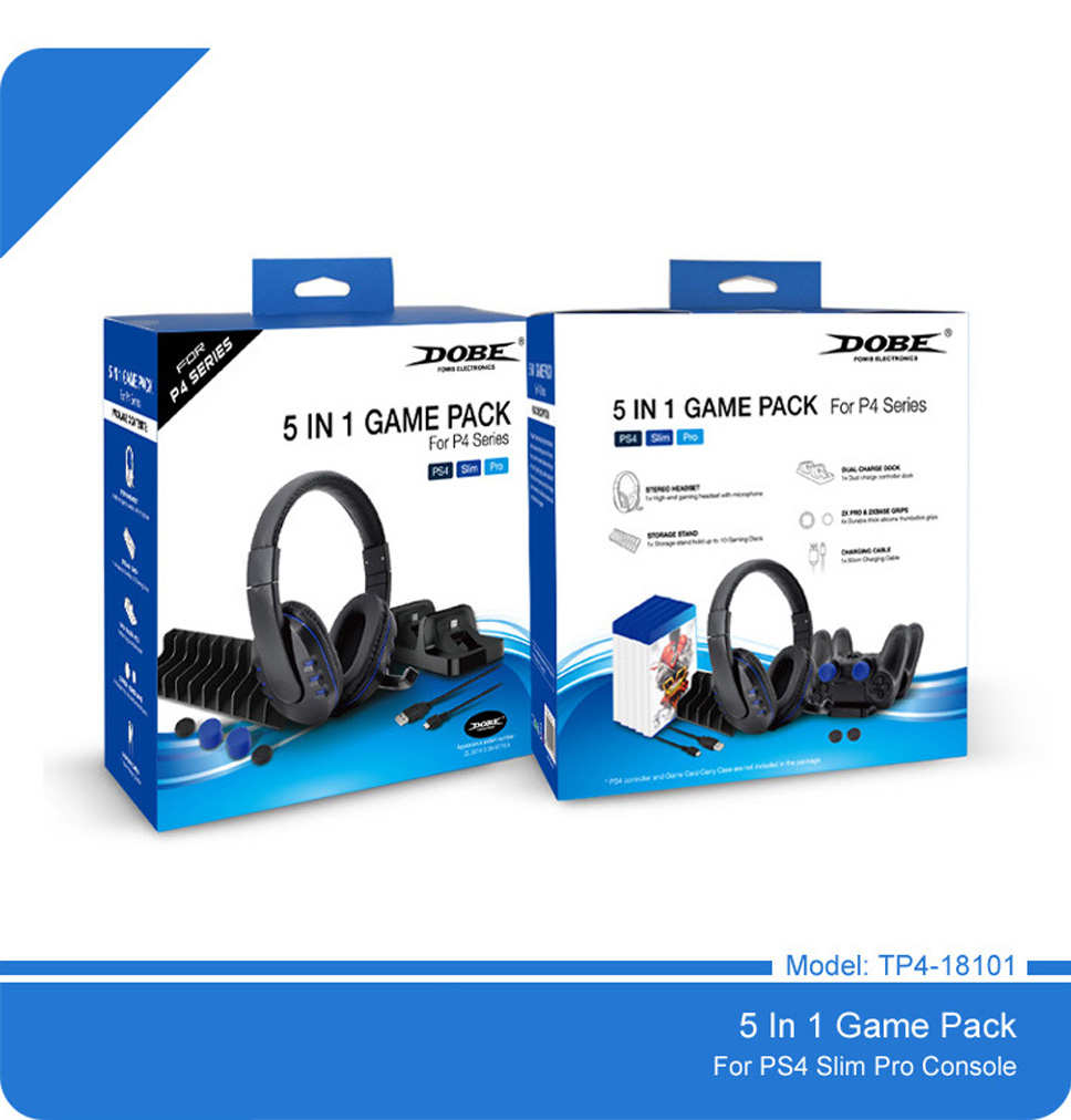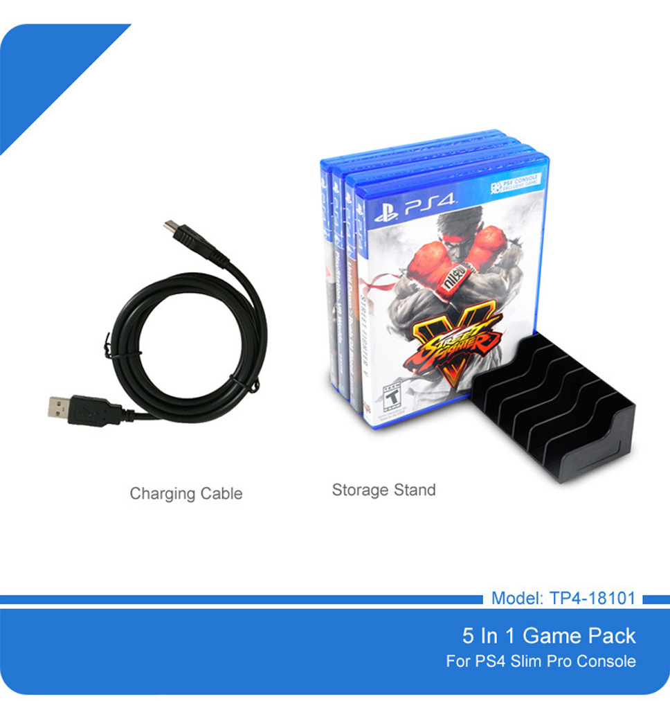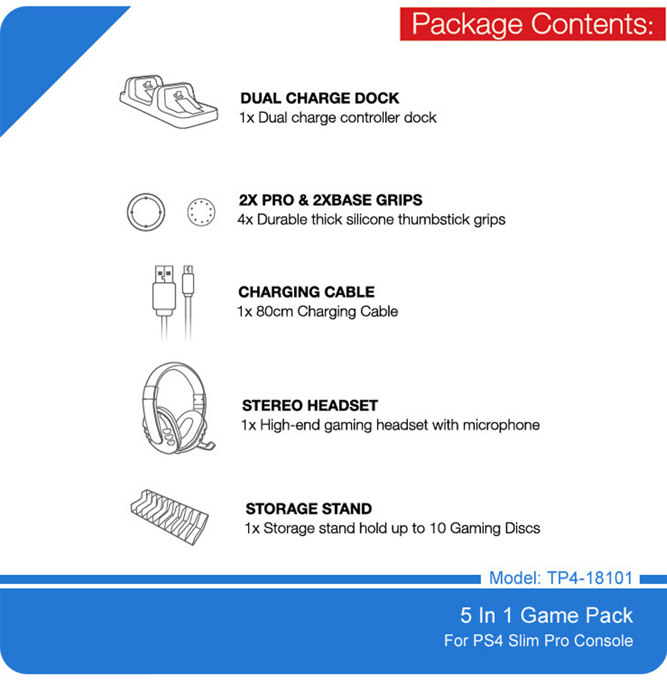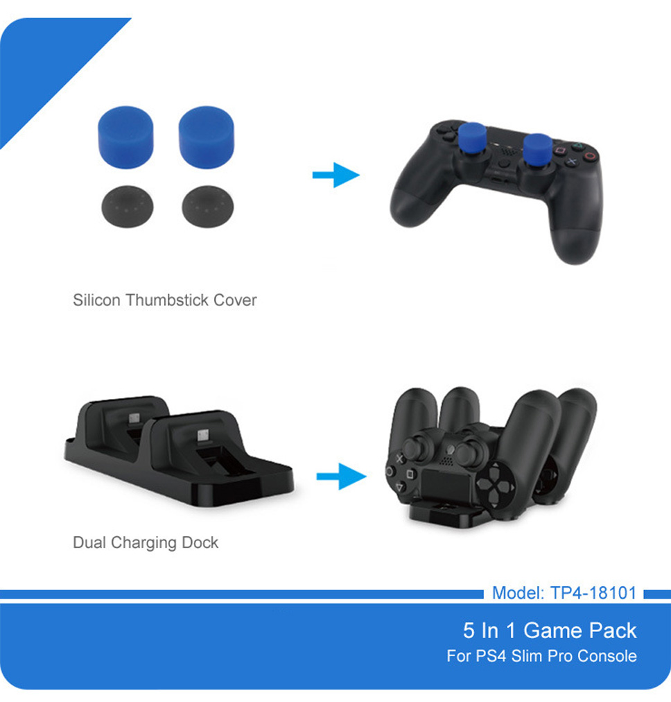 Product Description Model Number: TP4-18101 Compatible Brand/Model: Sony 1: 5-in-1 kit for PS4 game consoles, comes with headphone, charger, button cap, game rack 2: Suitable for all kinds of gamers...
