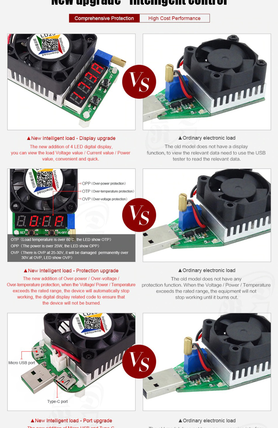 RD LD35 Electronic Load Resistor, USB Discharge Battery Test LED Display Fan Adjustable Current Voltage Meter 35W Black