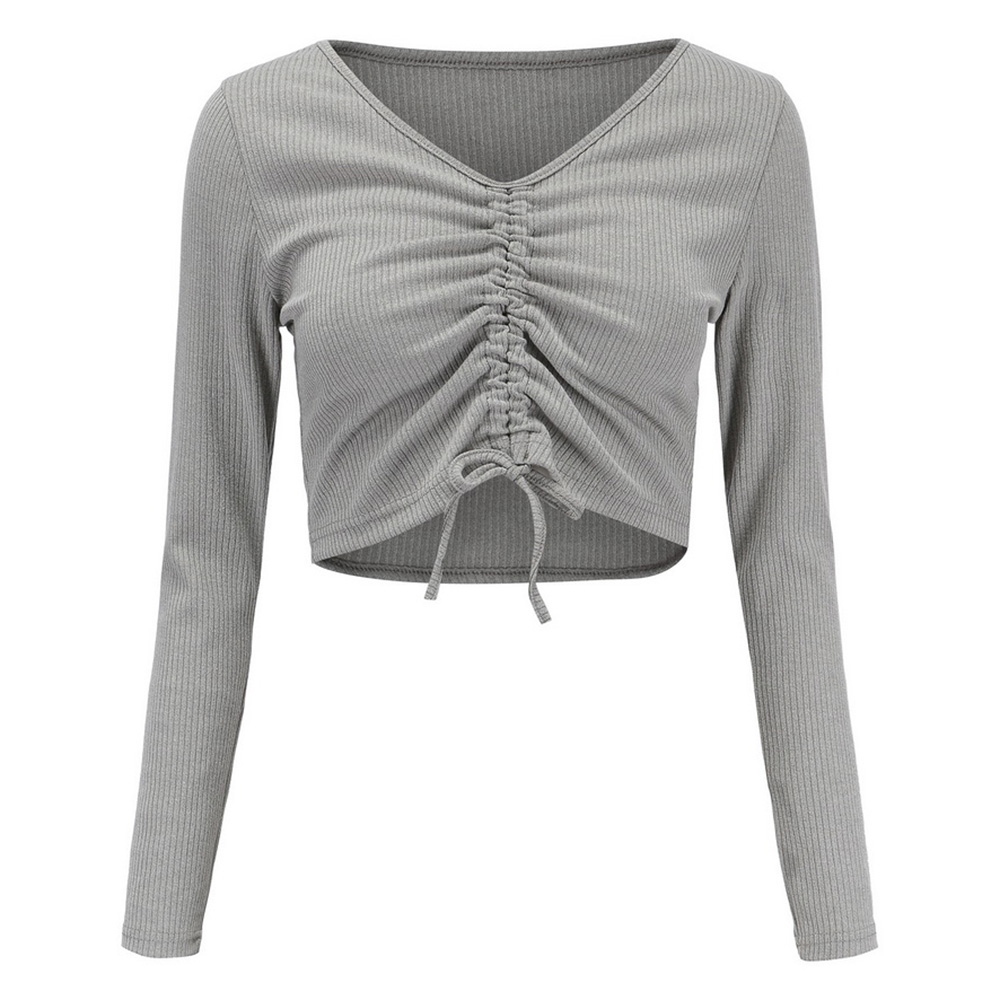 Sexy Causal Winter Autumn V Neck Drawstring Long Sleeve Knitted Sweater Women Slim Pullover Short Top For Women Gray/M