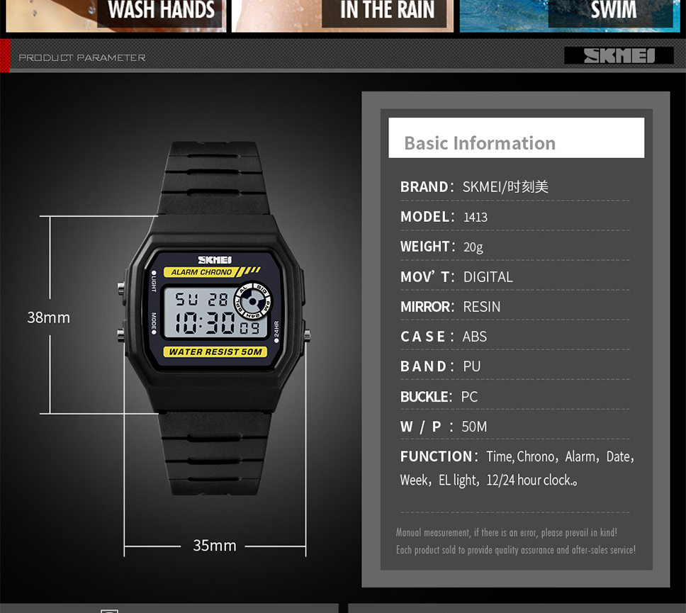 Product Description Dial Diameter: 35mm Case Thickness: 9mm Band Length: / Band Width: / Model Number: 1413 Case Shape: Square Dial Window Material Type: Glass Boxes & Cases Material: No...