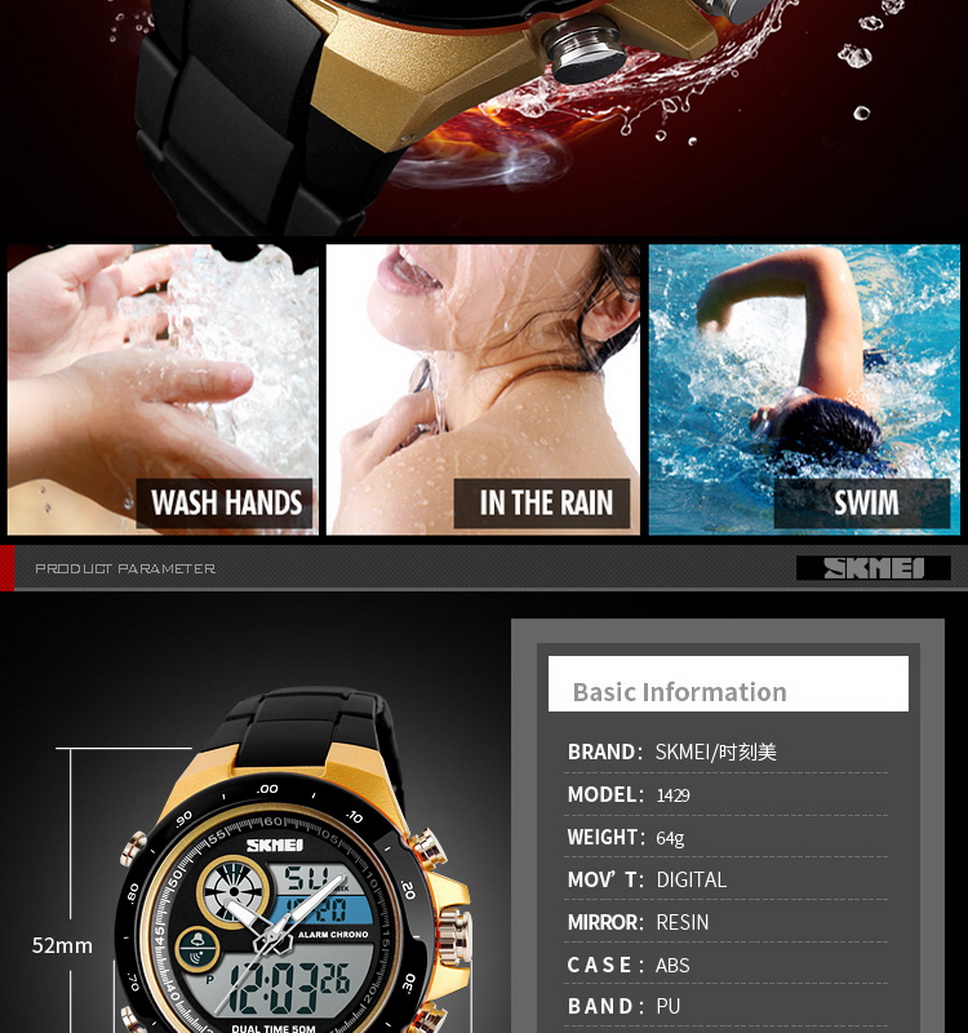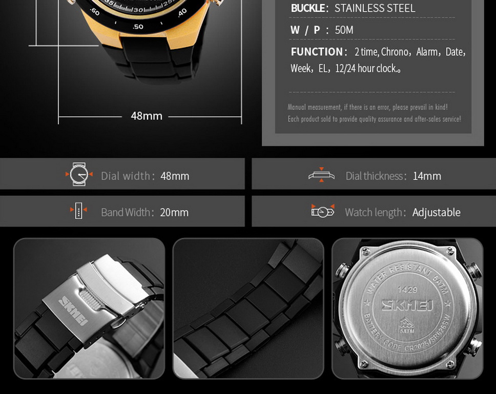 Product Description Case Thickness: 14mm Band Width: / Model Number: 1429 Dial Diameter: 48mm Band Length: / Feature: None Movement: Digital Band Material Type: PU Case Shape: Round Dial Window...