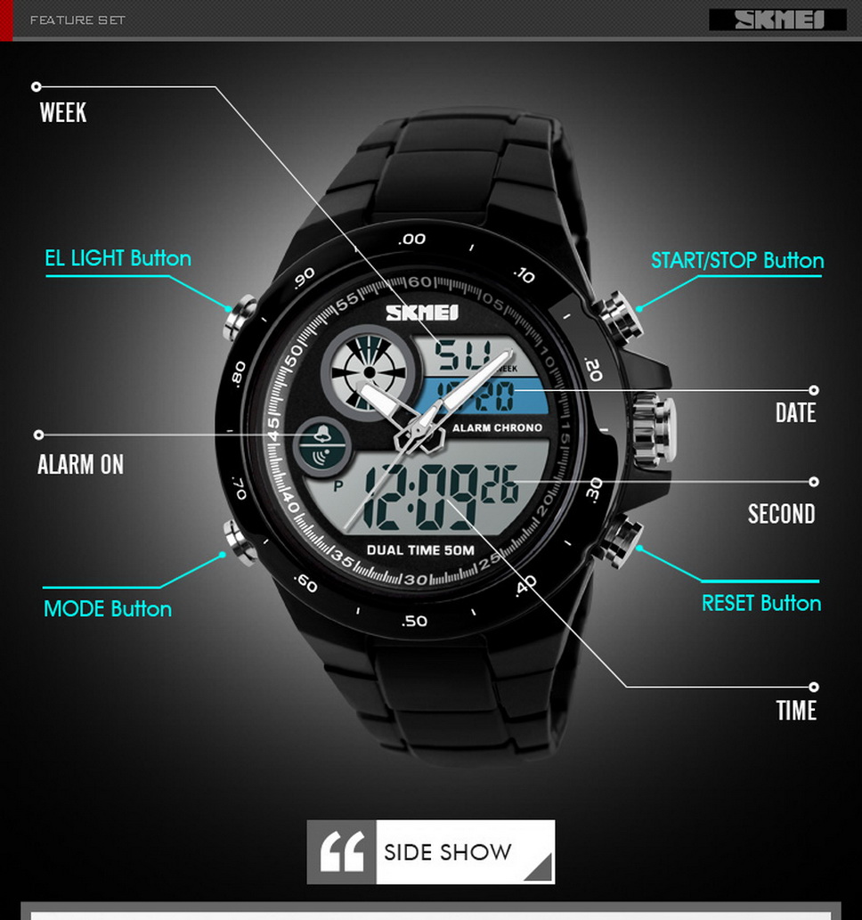 1. Convert countdown, timed alarm, time and other functions, backlight button, switch hour, minute, week, month and day when setting