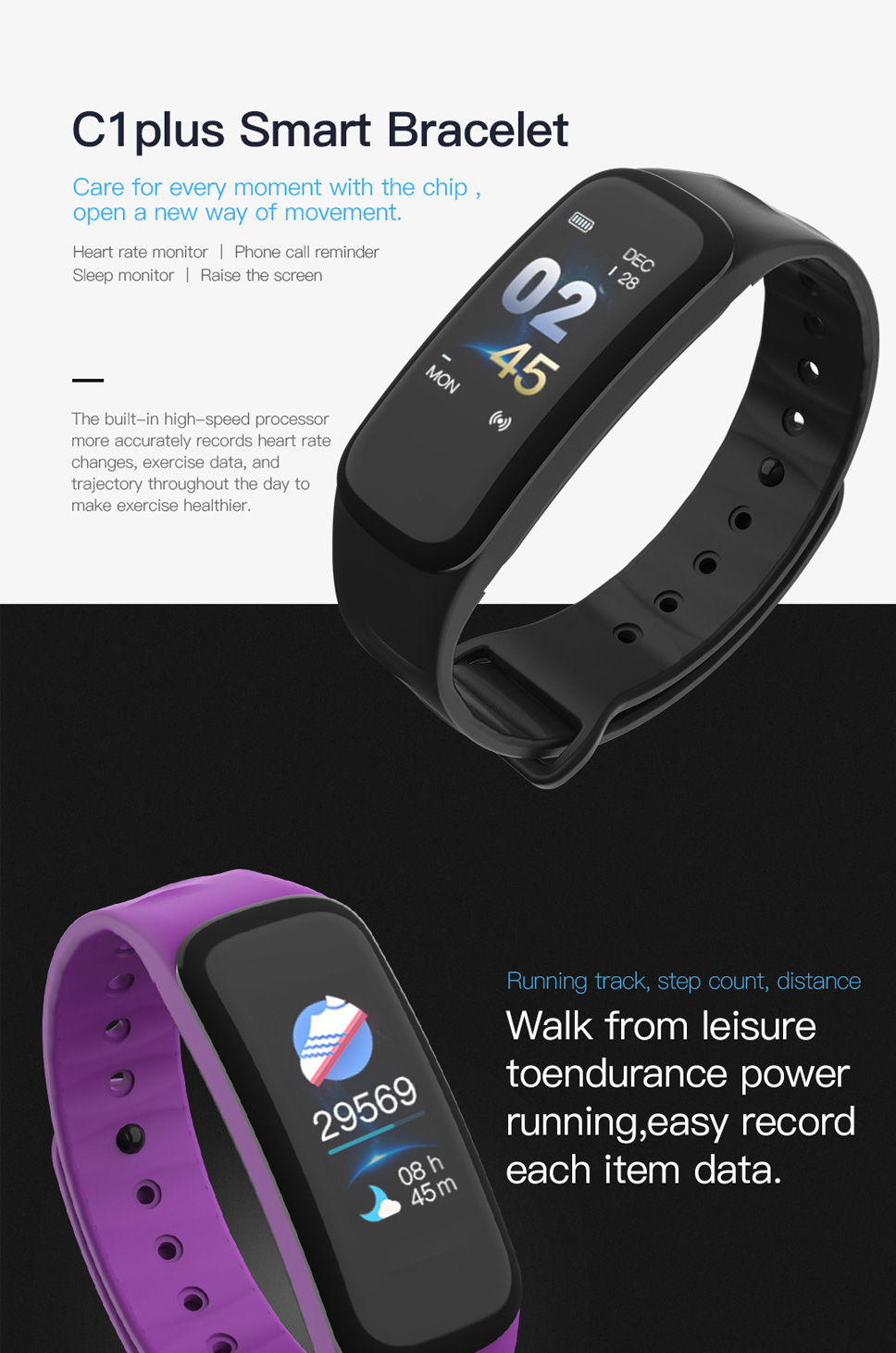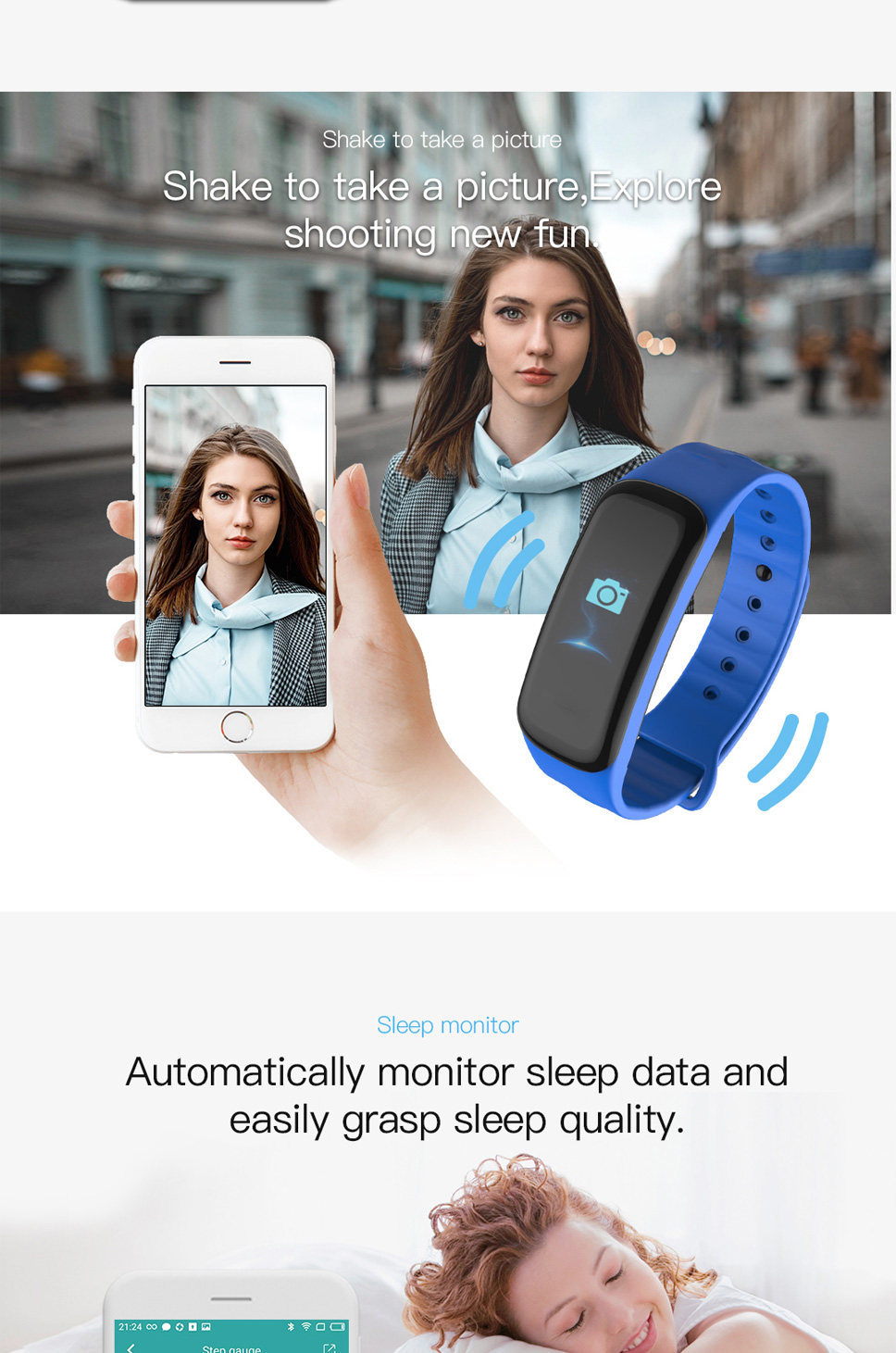 1: time display, step counting, calories, distance, hand raised screen, sleep monitoring, running track, call reminder, shake photo, stopwatch, sedentary reminder