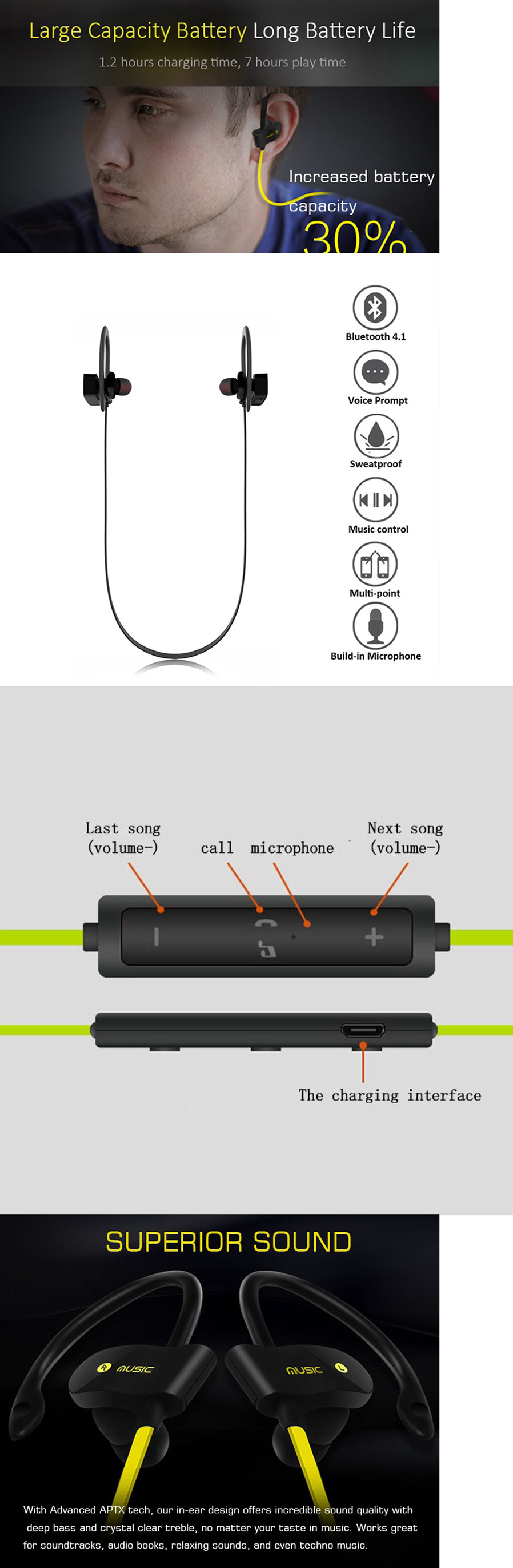 is designed for sports usage , made by waterproof material, ergonomic innovative and waterproof sweatproof design ensures this headset is comfortable and secure for sports, running, jogging ,walking ,exercising,etc.
