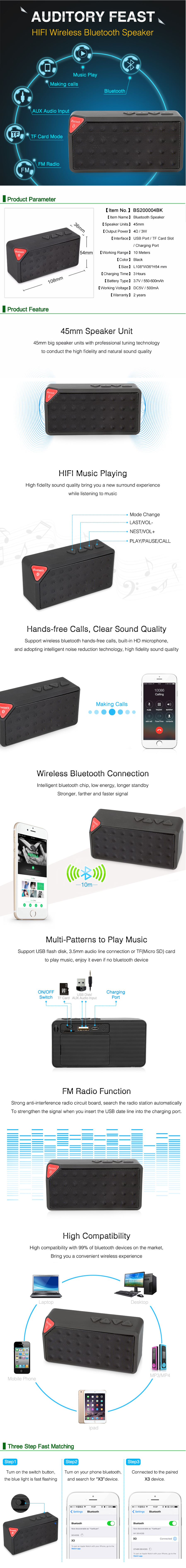 Product Description Model Number: X3 Wi-Fi Music: Other Playback Function: MP3 Power Source: Battery Feature: None Communication: Bluetooth Voice Control: No Frequency Range: 20Hz-20KHz Output Power: 3W Display Screen: No,No...