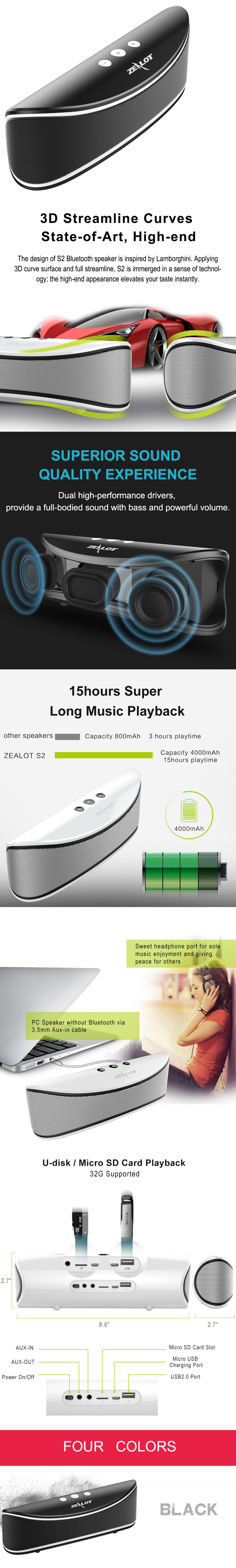 Zealot S2 Portable Bluetooth 4.0 Wireless Speaker Support TF Card/USB Drive Car Party Speaker Sound System 3D Stereo Mus Black